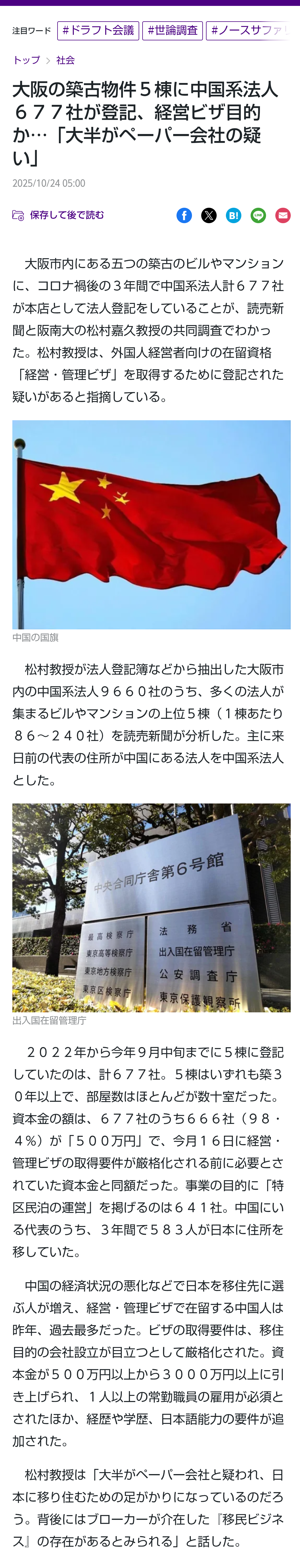 | … | 16無題Name名無し 25/10/24(金)10:44:00No.755288そうだねx7>>大阪の築古物件5棟に中国系法人677社が登記、経営ビザ目的か…「大半がペーパー会社の疑い」 |