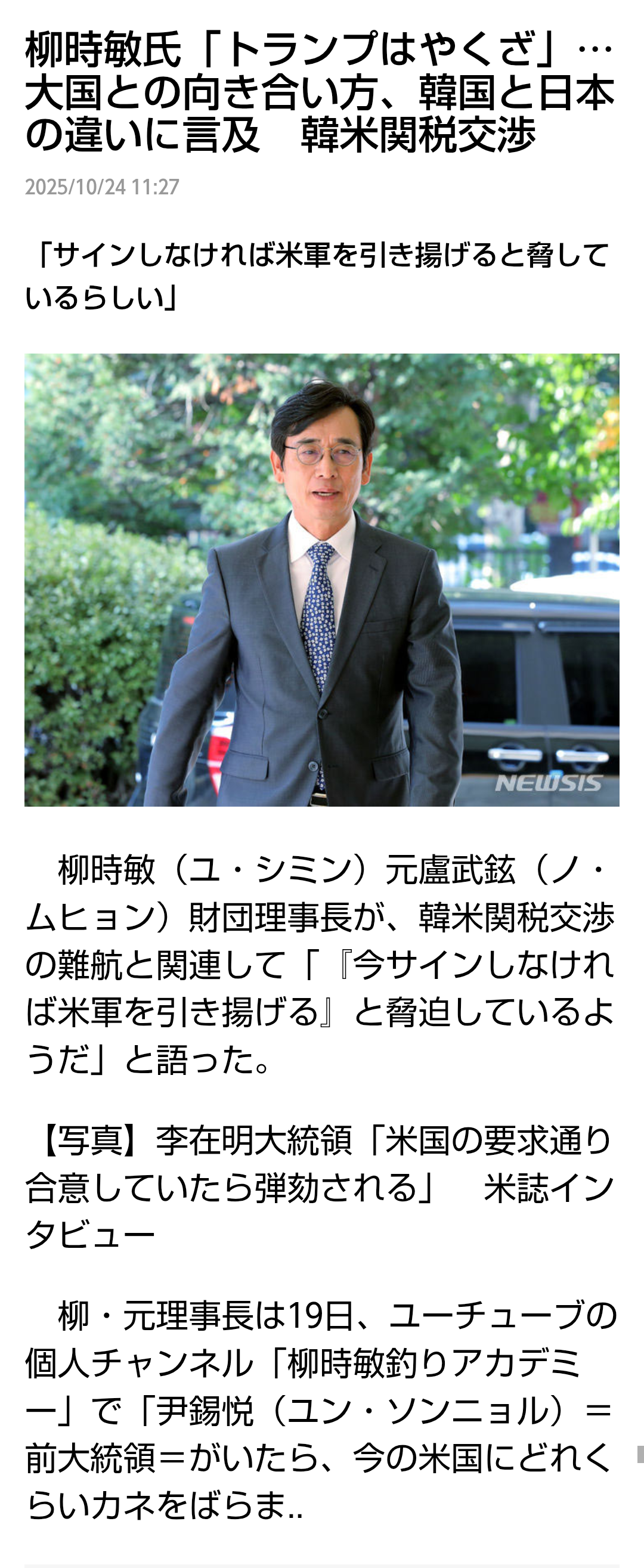 | … | 53無題Name名無し 25/10/24(金)12:52:35No.755325+ 1761277955190.png-(1409816 B) >柳時敏氏「トランプはやくざ」…大国との向き合い方、韓国と日本の違いに言及 韓米関税交渉 |