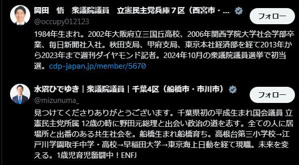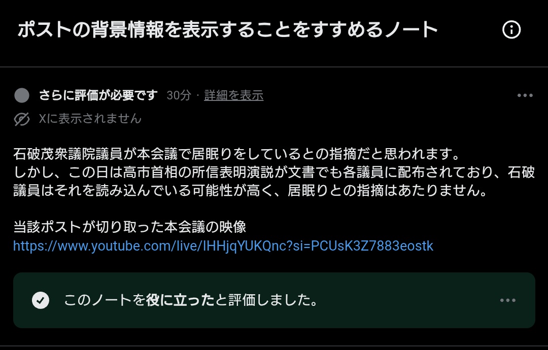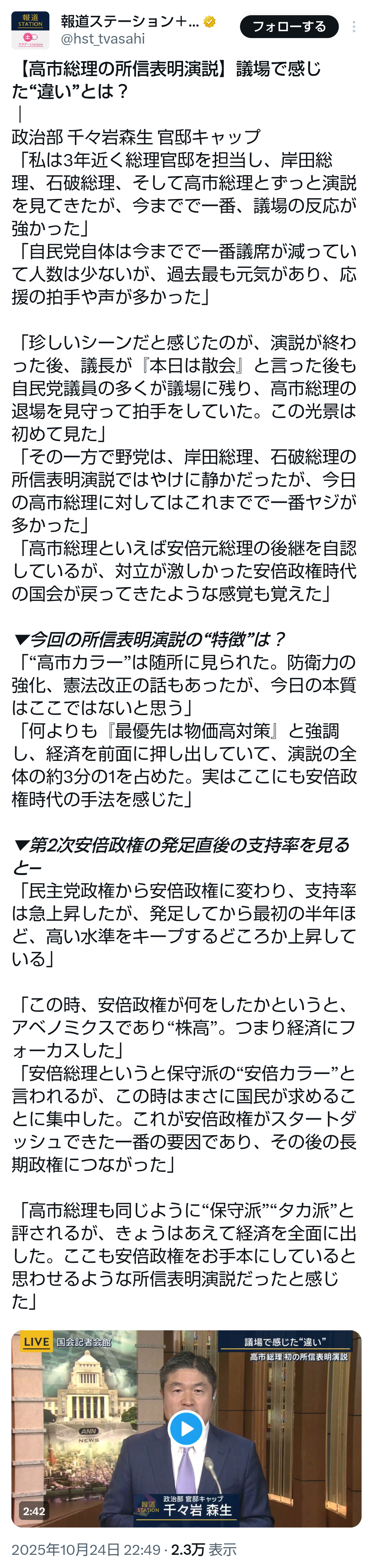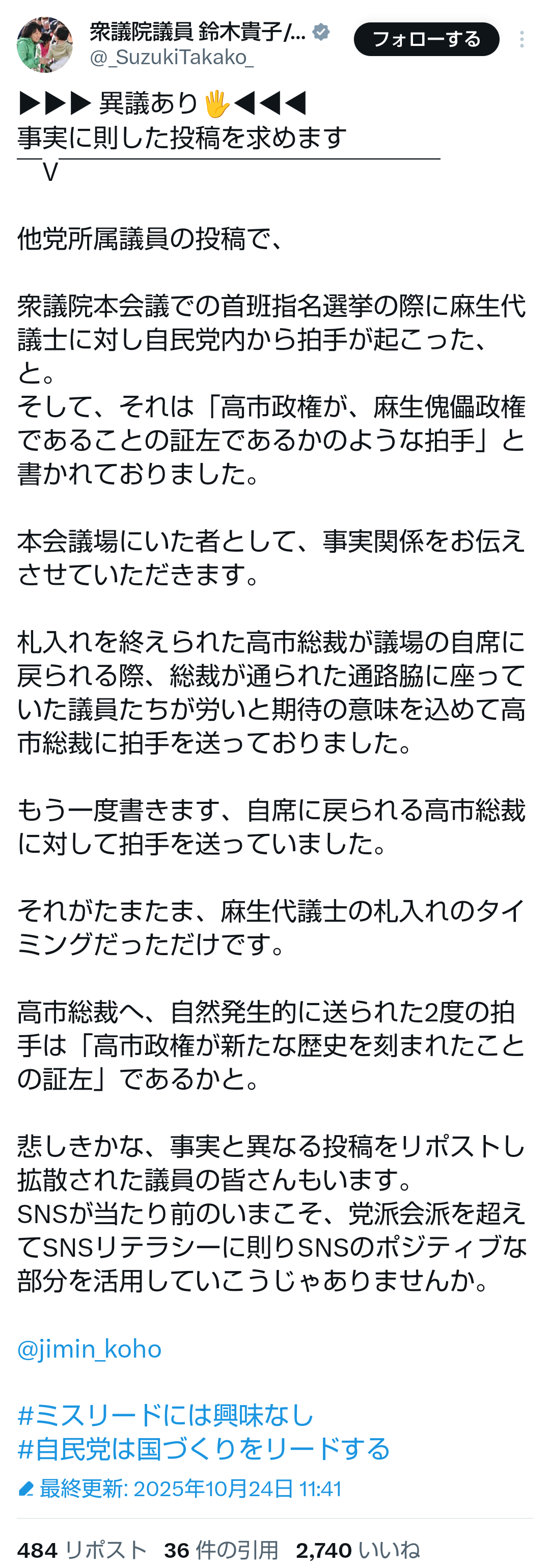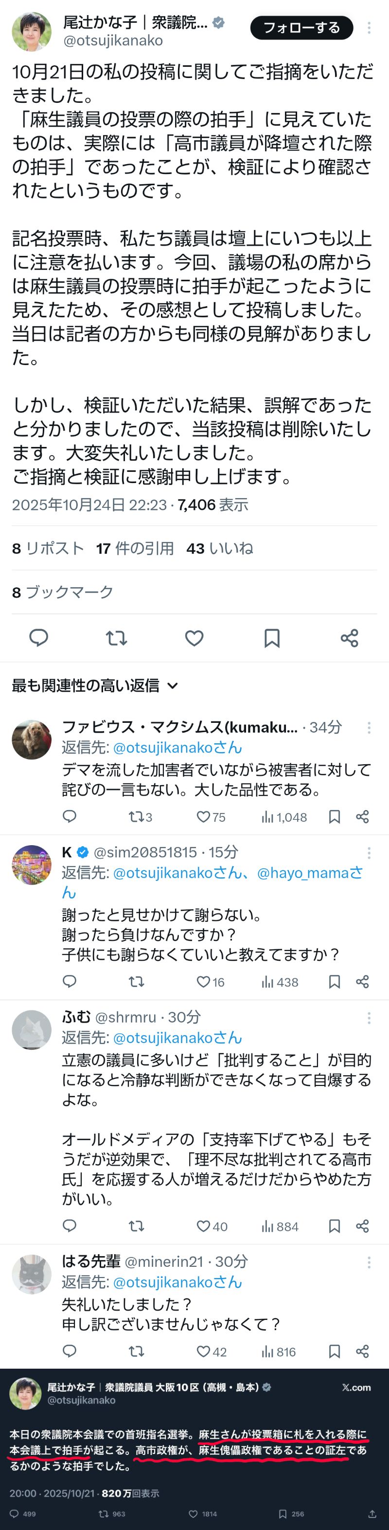 | … | 192無題Name名無し 25/10/24(金)23:27:37No.755469+>>記名投票時、私たち議員は壇上にいつも以上に注意を払います。今回、議場の私の席からは麻生議員の投票時に拍手が起こったように見えたため、その感想として投稿しました。当日は記者の方からも同様の見解がありました。 |