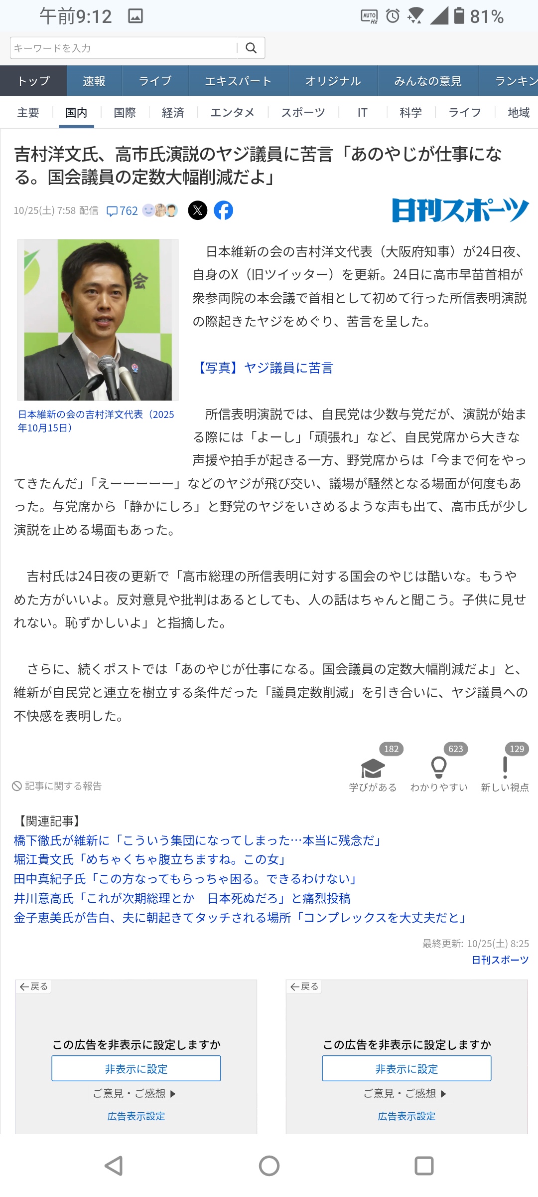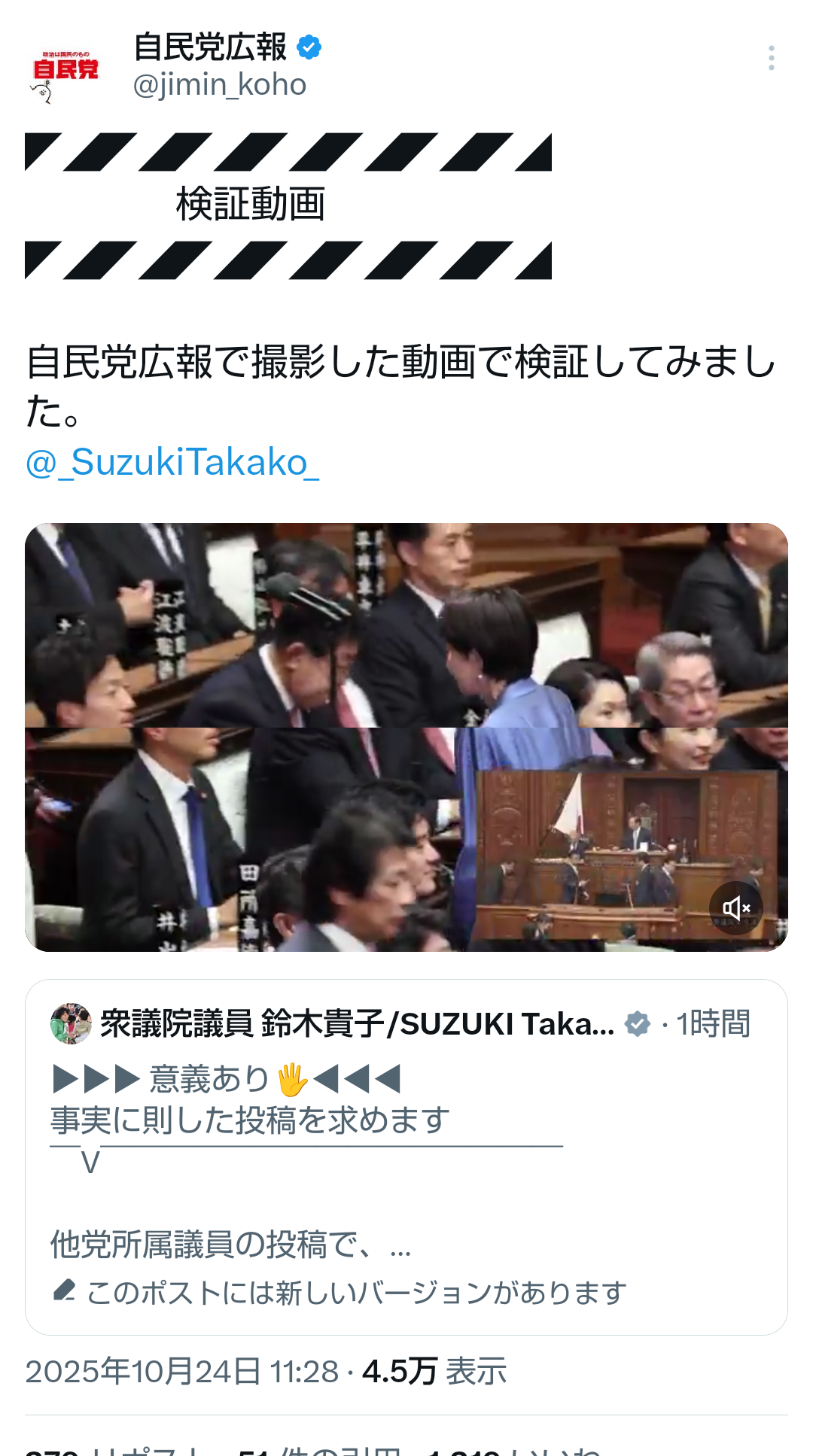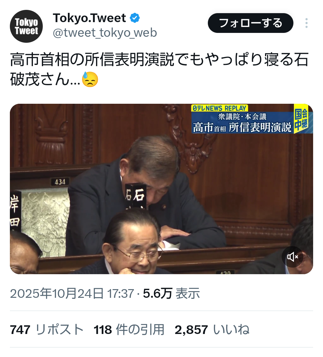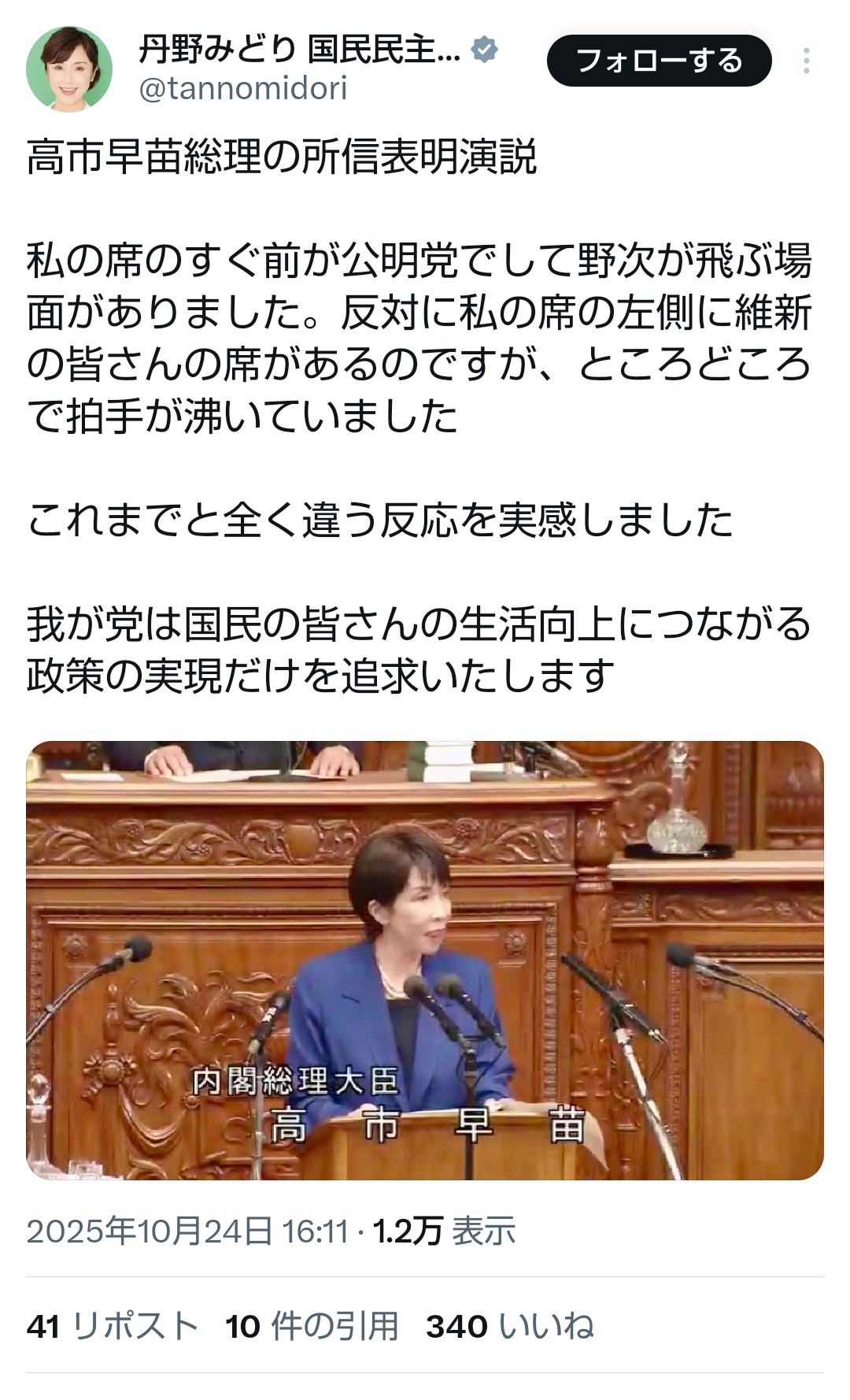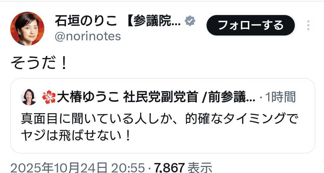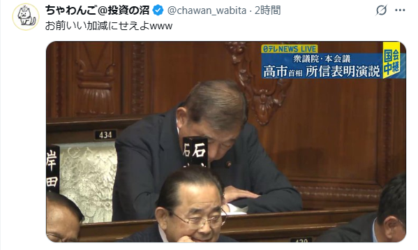 | … | 72無題Name名無し 25/10/24(金)14:10:00No.755344そうだねx3いまは所信表明演説を聞く場であって発現許可を得てもいない一議員が |