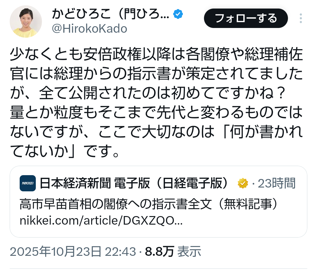 | … | 67無題Name名無し 25/10/24(金)13:23:09No.755339そうだねx1 1761279789380.png-(246501 B) >少なくとも安倍政権以降は各閣僚や総理補佐官には総理からの指示書が策定されてましたが、全て公開されたのは初めてですかね? |