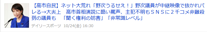 | … | 71無題Name名無し 25/10/24(金)14:06:16No.755343そうだねx1高市さんの所信表明にガヤ入れてる奴がいるなあ |