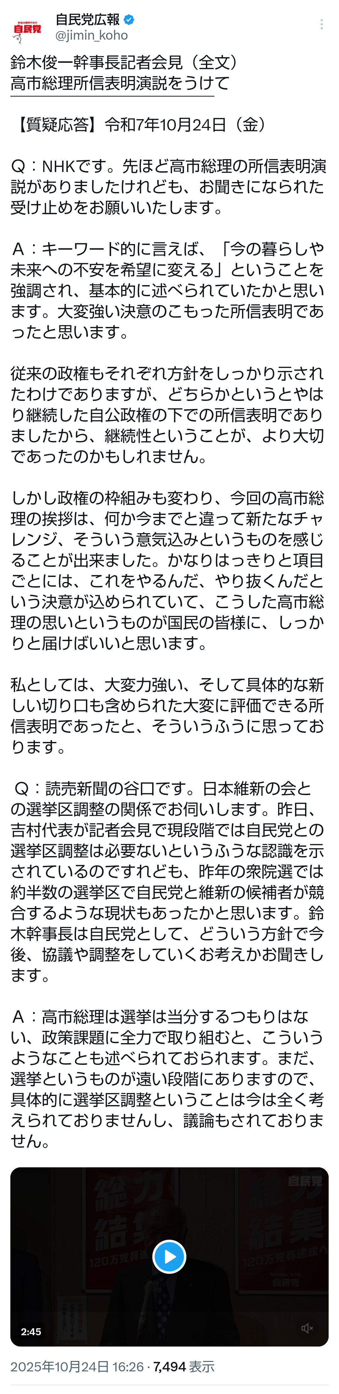 | … | 78無題Name名無し 25/10/24(金)14:29:26No.755350そうだねx2自民党広報で動画と文字起こしてくれるだろうから待ってるわ |