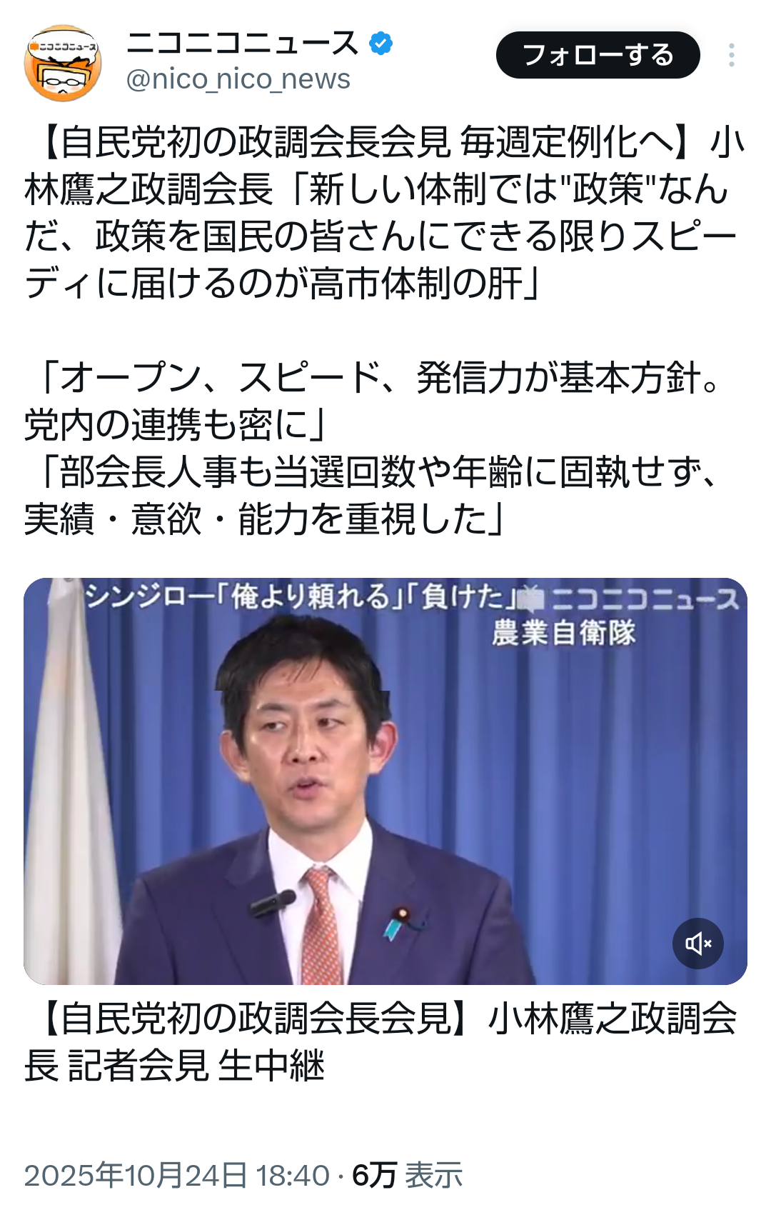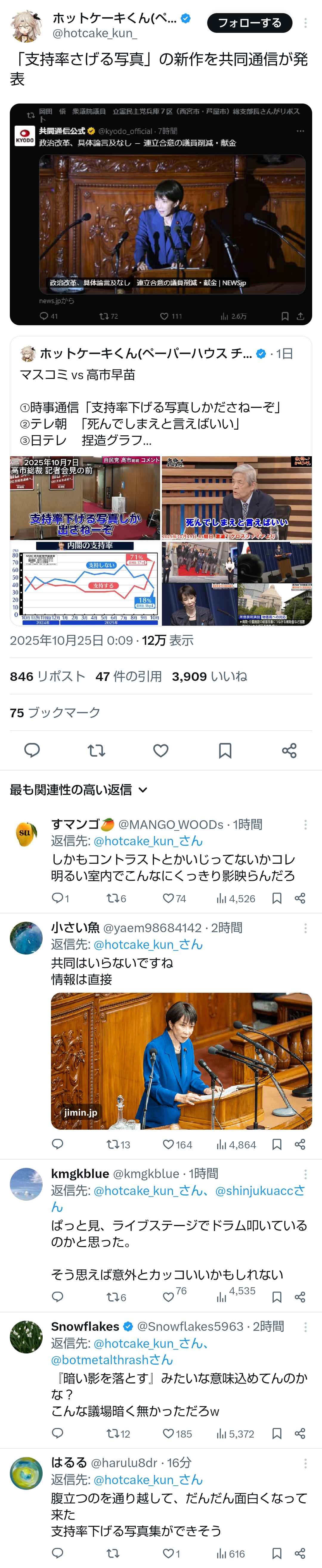 | … | 80無題Name名無し 25/10/24(金)14:32:11No.755352そうだねx3オールドメディアがアーアー聞こえないして報道しなくてもSNSとかネットメディアで所信表明全部視聴できる時代だからね |