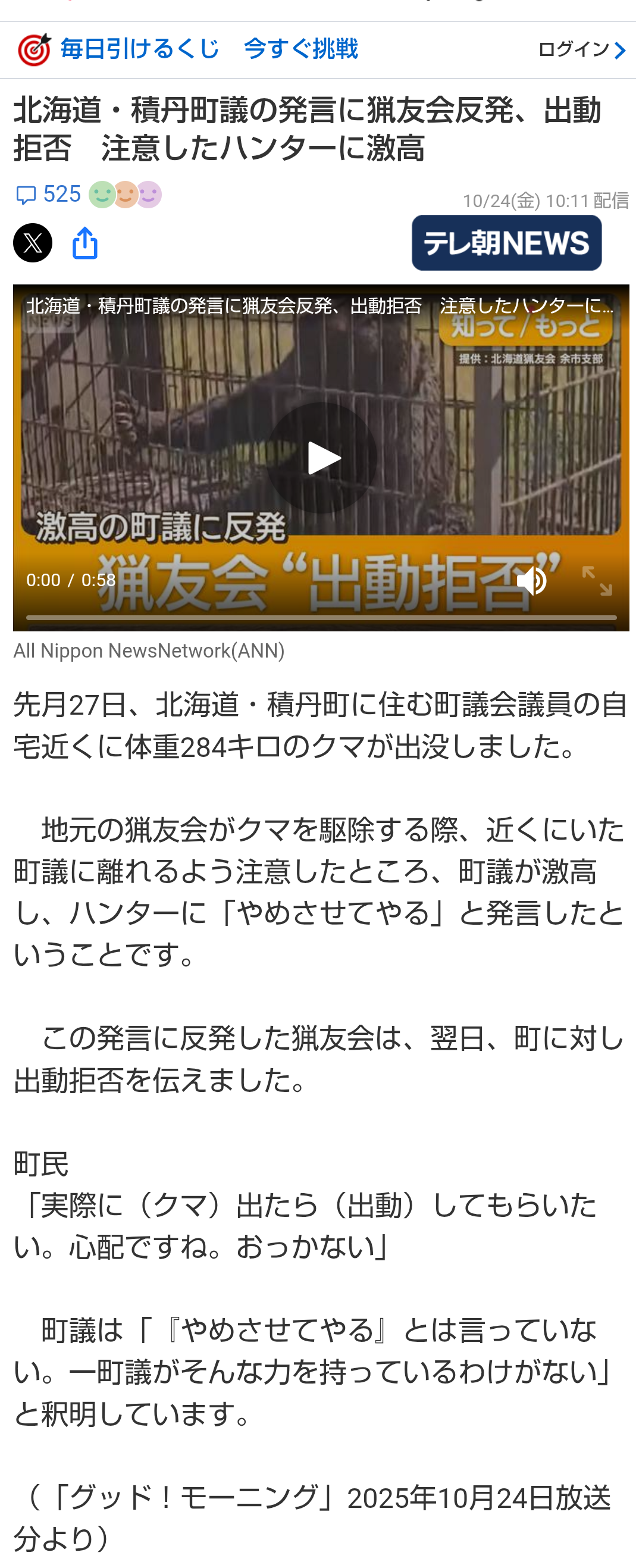 | … | 223無題Name名無し 25/10/25(土)09:59:42No.755504+ 1761353982214.png-(1058213 B) >北海道・積丹町議の発言に猟友会反発、出動拒否 注意したハンターに激高 |