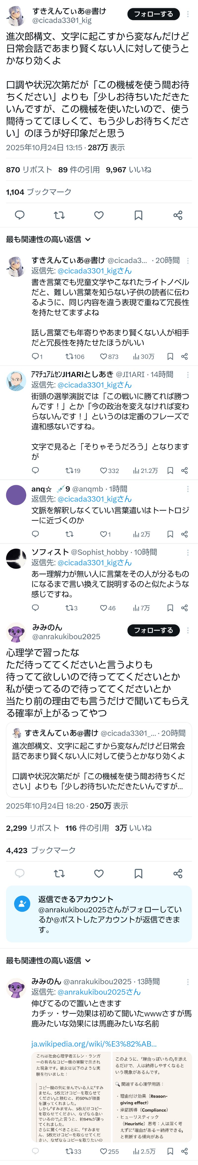 | … | 233無題Name名無し 25/10/25(土)10:38:03No.755514+>一番最後の「〜ので」を付けるとその内容が適当通り越していい加減でも人は流されてしまいがちというのはなんかで聞いたな |