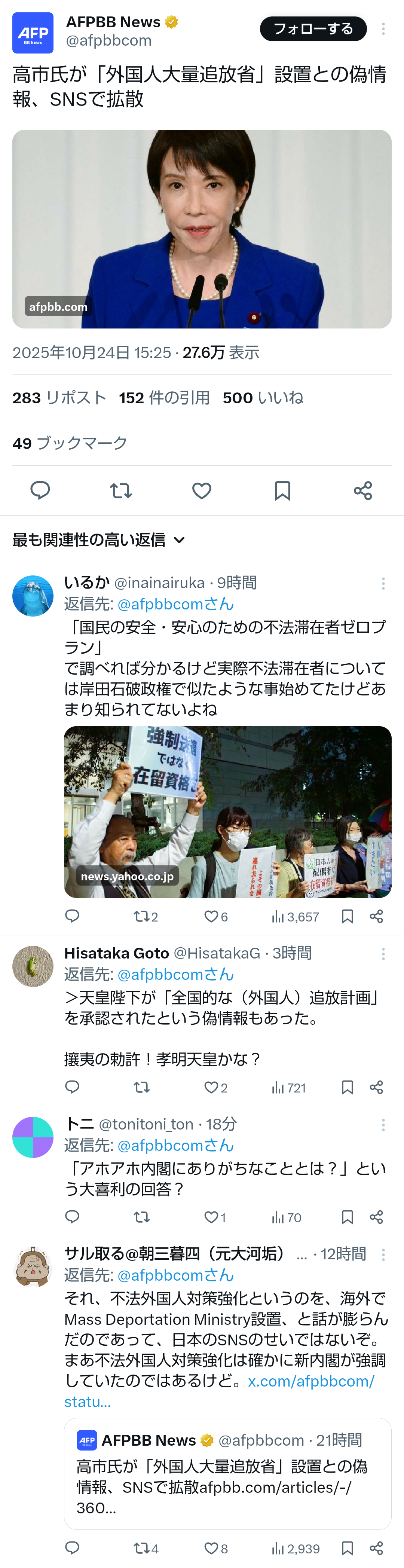 | … | 245無題Name名無し 25/10/25(土)12:27:39No.755530+ 1761362859669.png-(1531945 B) >高市氏が「外国人大量追放省」設置との偽情報、SNSで拡散 |