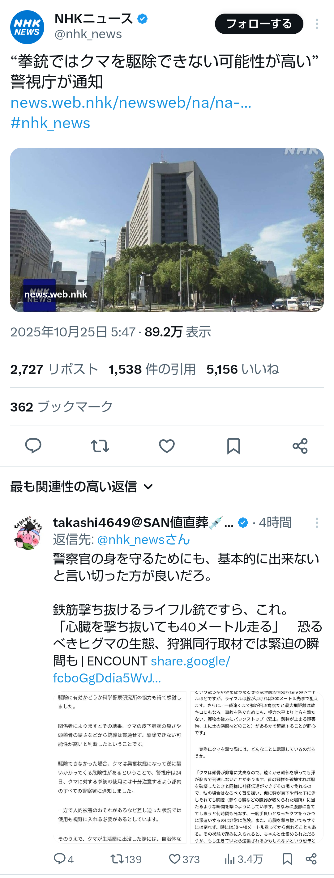 | … | 262無題Name名無し 25/10/25(土)13:36:28No.755551+ 1761366988239.png-(1324698 B) >“拳銃ではクマを駆除できない可能性が高い” 警視庁が通知 |