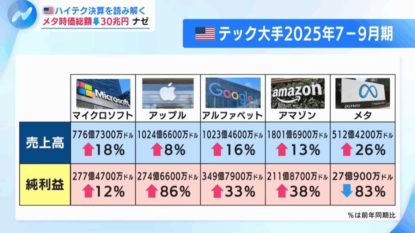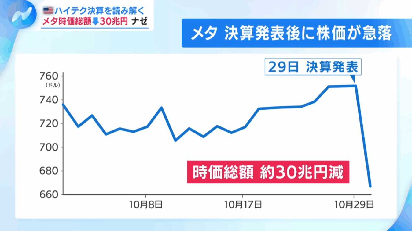 【シリコンバレー=山田遼太郎、ニューヨーク=竹内弘文】米メタの株価が30日、約1割急落し、時価総額で約30兆円分が吹き飛んだ。人工知能(AI)の開発で出遅れた焦りから、インフラ投資を倍増し4兆円規模の巨額の社債も発行する。AIへの過剰投資が懸念される中、回収の道筋を明確に描けぬまま挽回を急ぐ手法は市場の警戒を招いた。
