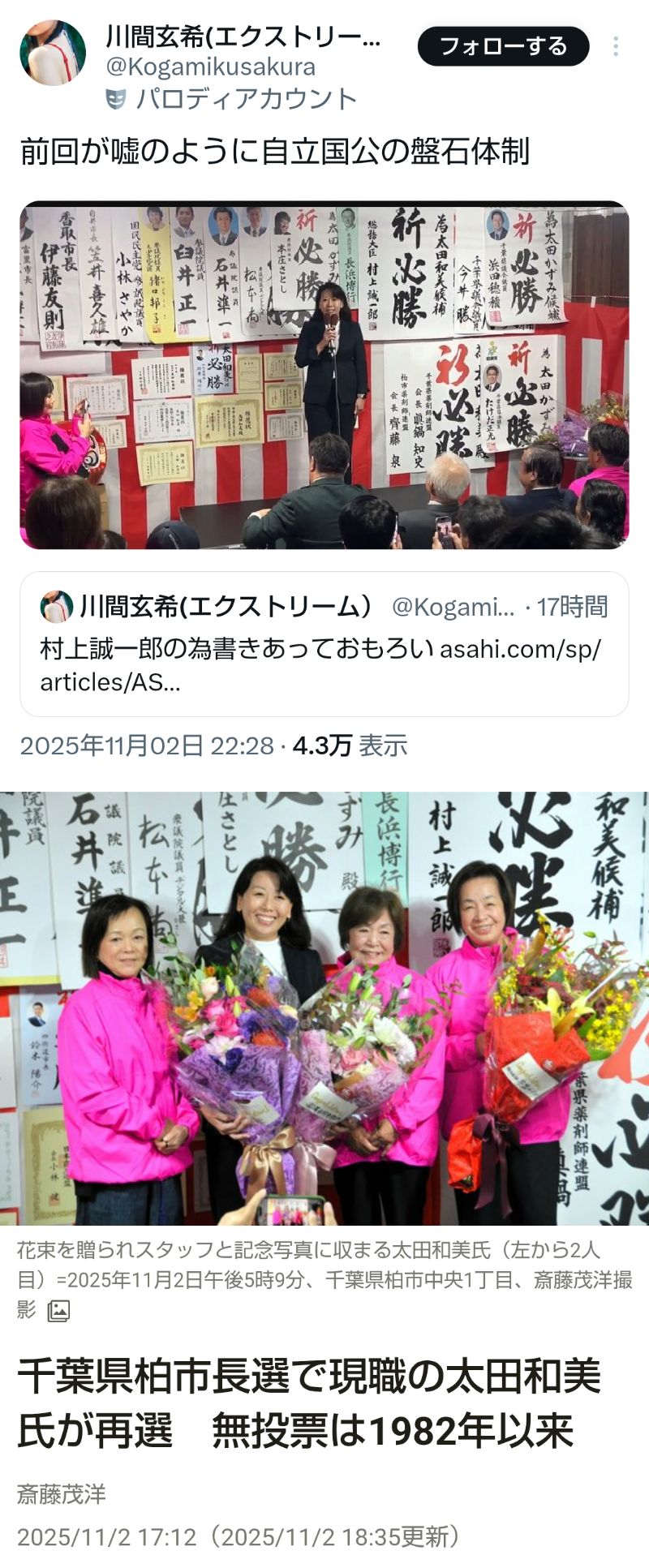 | … | 29無題Name名無し 25/11/03(月)15:45:23No.757478そうだねx1 1762152323955.jpg-(269710 B) >千葉県柏市長選で現職の太田和美氏が再選 無投票は1982年以来 |