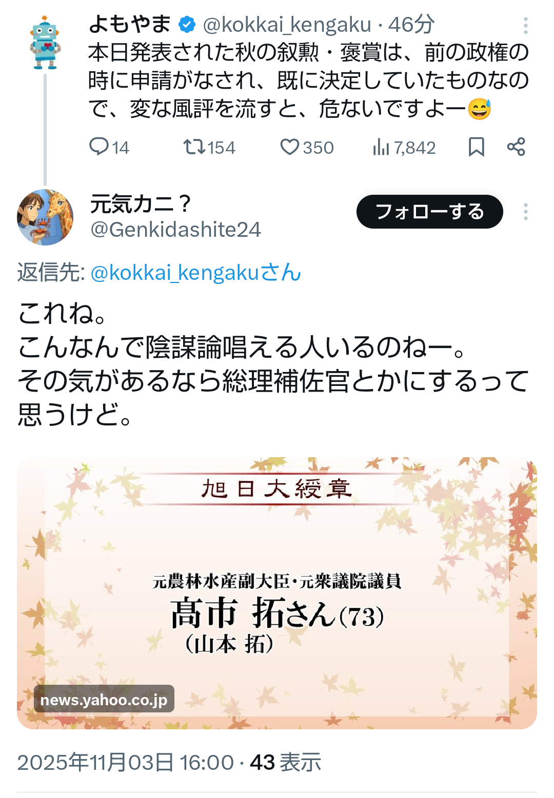 | … | 35無題Name名無し 25/11/03(月)16:13:46No.757484そうだねx2国会議員から大臣にまでなった人の旭日大綬章受章は珍しくないからなあ |