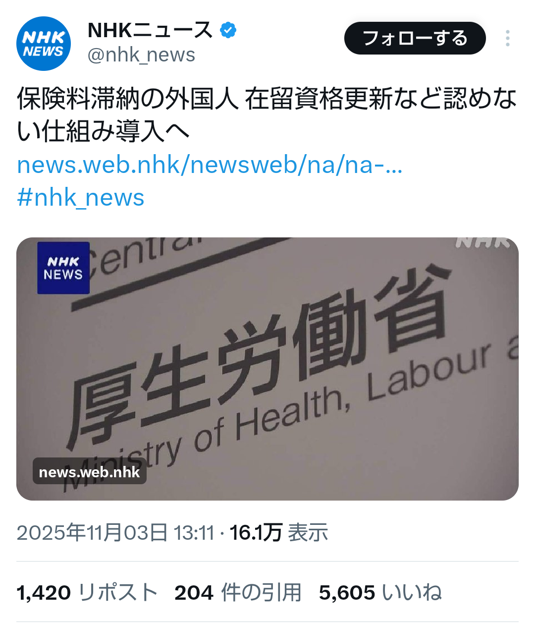 | … | 38無題Name名無し 25/11/03(月)16:17:11No.757487そうだねx12 1762154231599.png-(406578 B) >保険料滞納の外国人 在留資格更新など認めない仕組み導入へ |