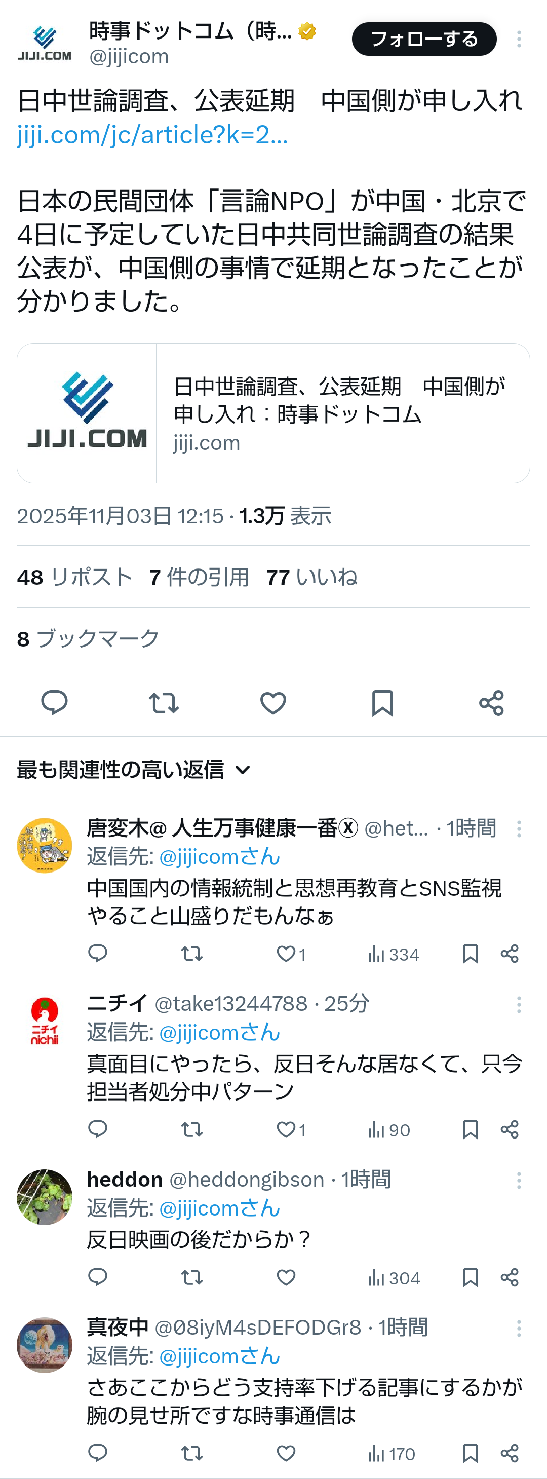 | … | 51無題Name名無し 25/11/03(月)17:45:10No.757502+ 1762159510454.png-(598238 B) >日中世論調査、公表延期 中国側が申し入れ |