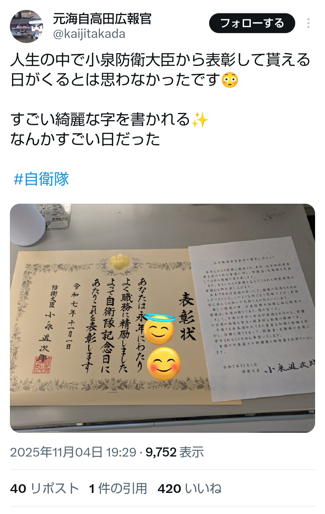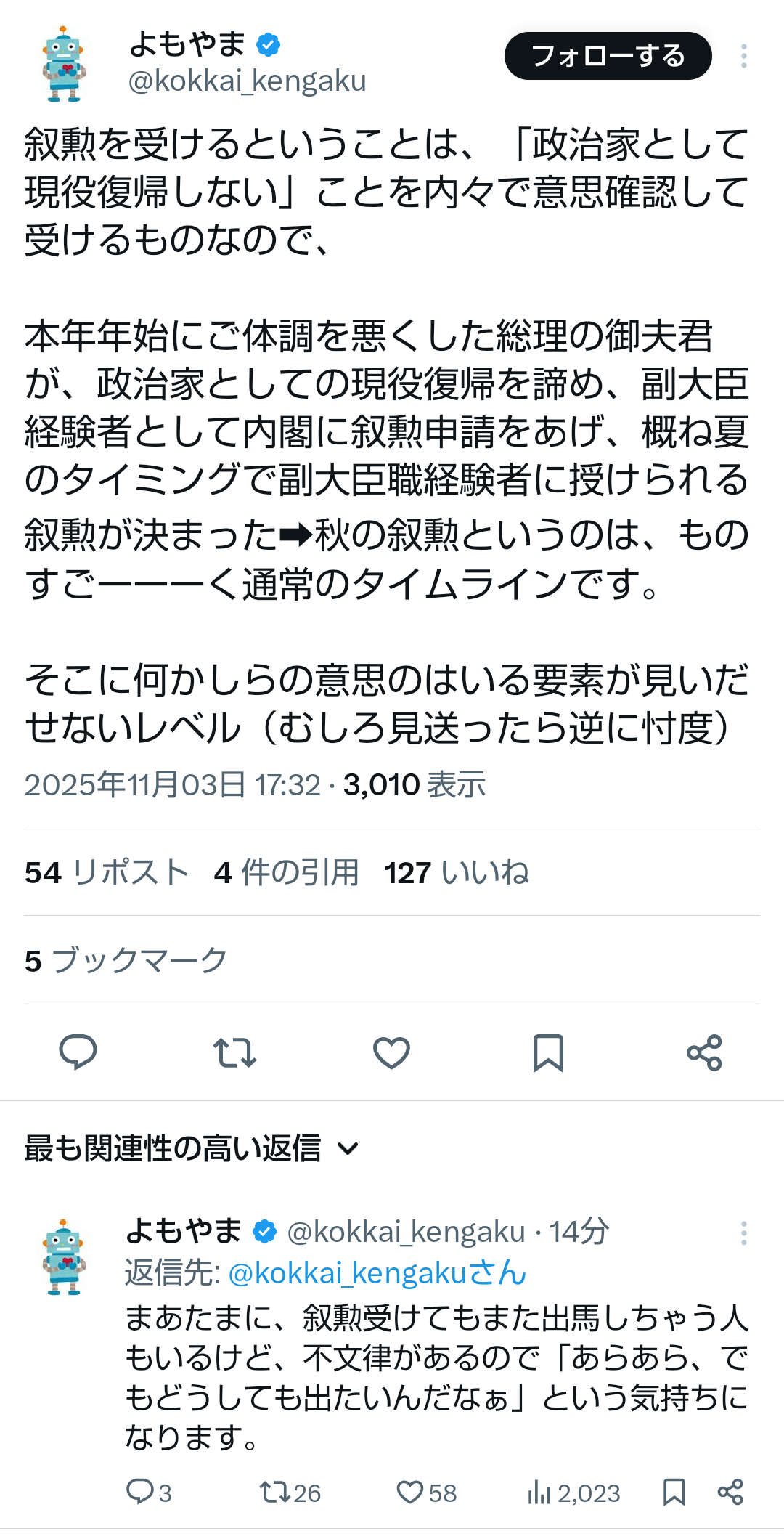 | … | 58無題Name名無し 25/11/03(月)17:55:55No.757509そうだねx1 1762160155427.png-(478179 B) >叙勲を受けるということは、「政治家として現役復帰しない」ことを内々で意思確認して受けるものなので、 |