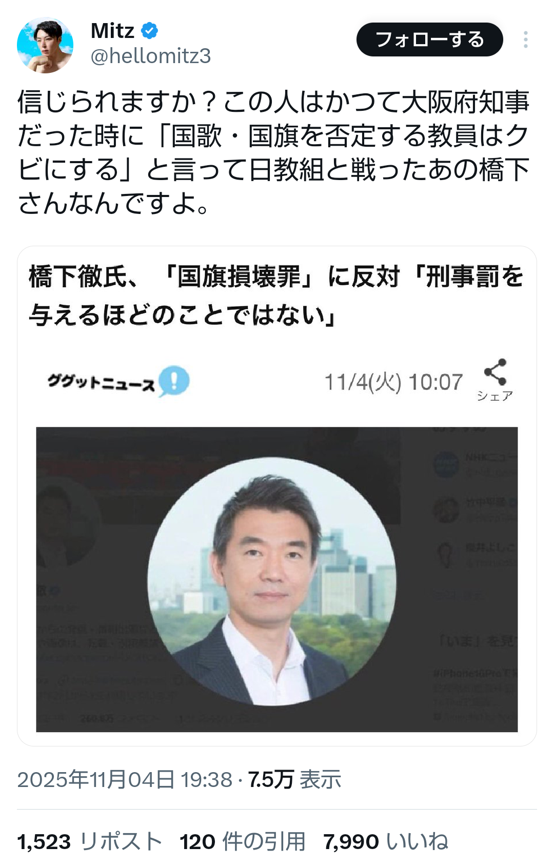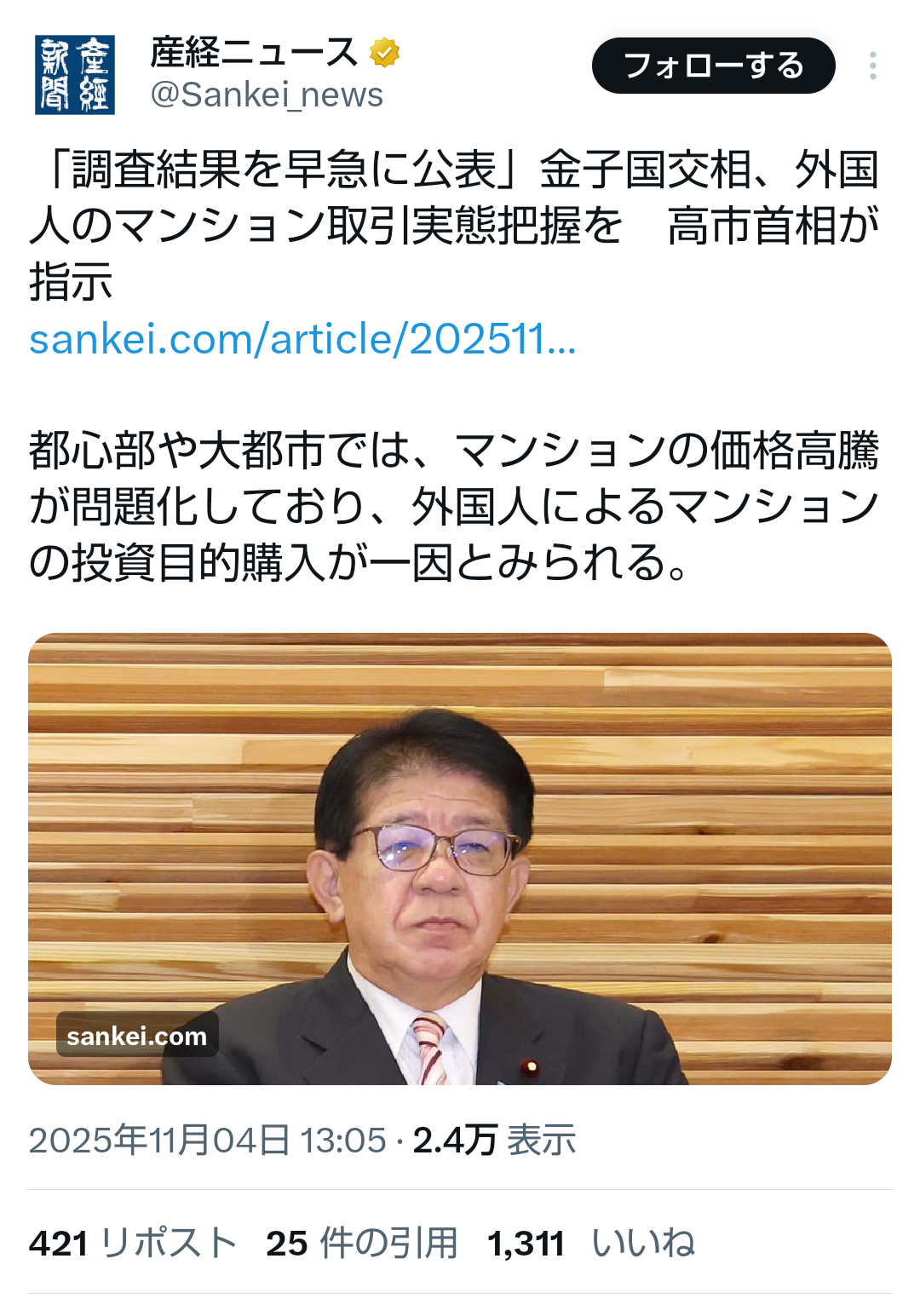 | … | 231無題Name名無し 25/11/04(火)18:05:46No.757719そうだねx2>全ての外国人を排斥する意図があると報道される |