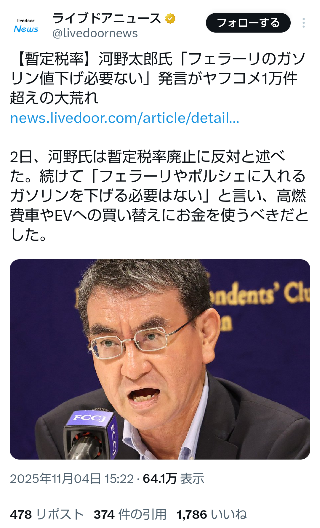 | … | 213無題Name名無し 25/11/04(火)17:25:13No.757700+ 1762244713509.png-(1022580 B) >【暫定税率】河野太郎氏「フェラーリのガソリン値下げ必要ない」発言がヤフコメ1万件超えの大荒れ |