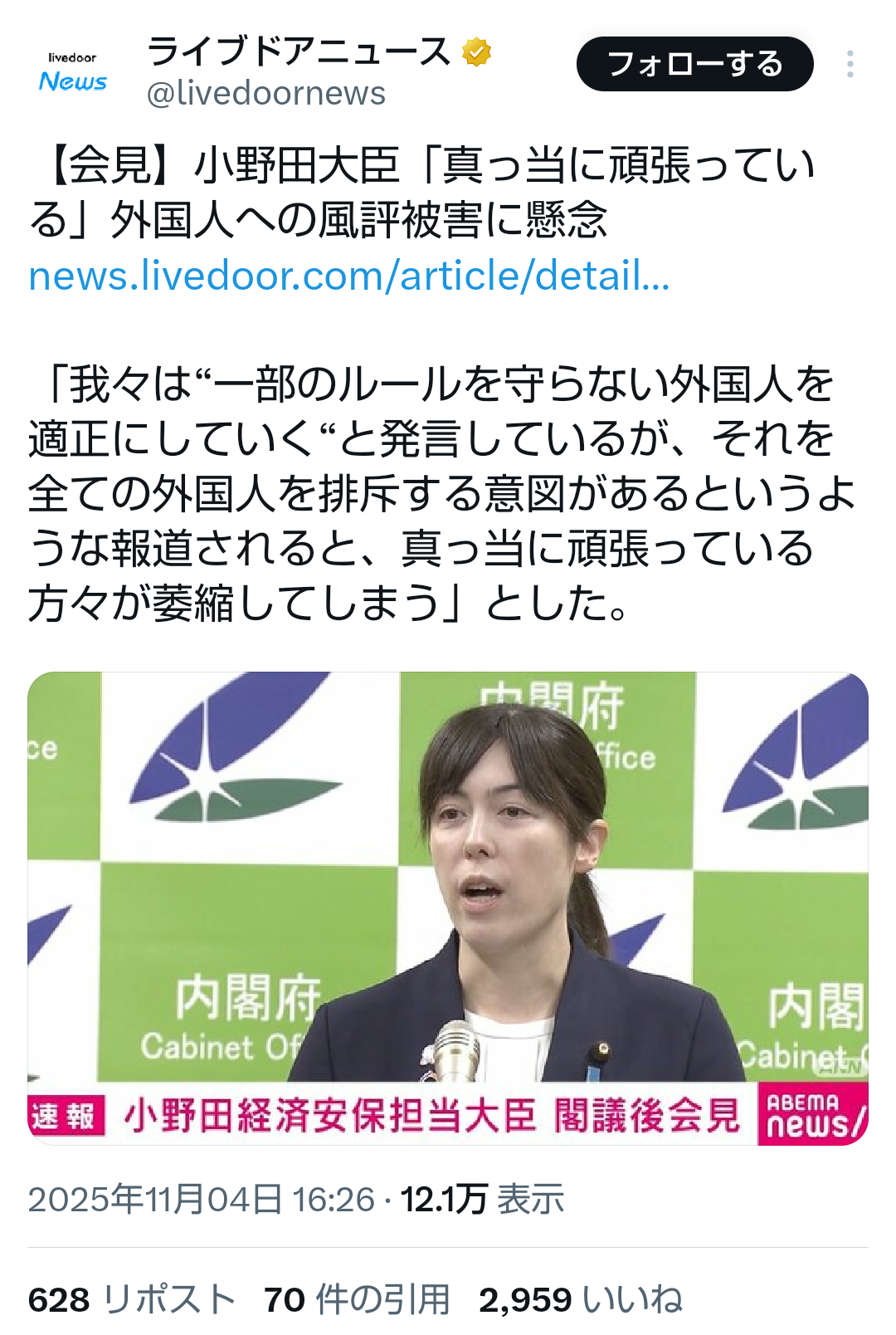 | … | 225無題Name名無し 25/11/04(火)17:56:25No.757713+ 1762246585894.png-(535812 B) >小野田大臣「私も外国のルーツが入っている人間として…」「全ての外国人を排斥する意図があると報道されると真っ当に頑張っている方々が萎縮してしまう」外国人への風評被害に懸念 |