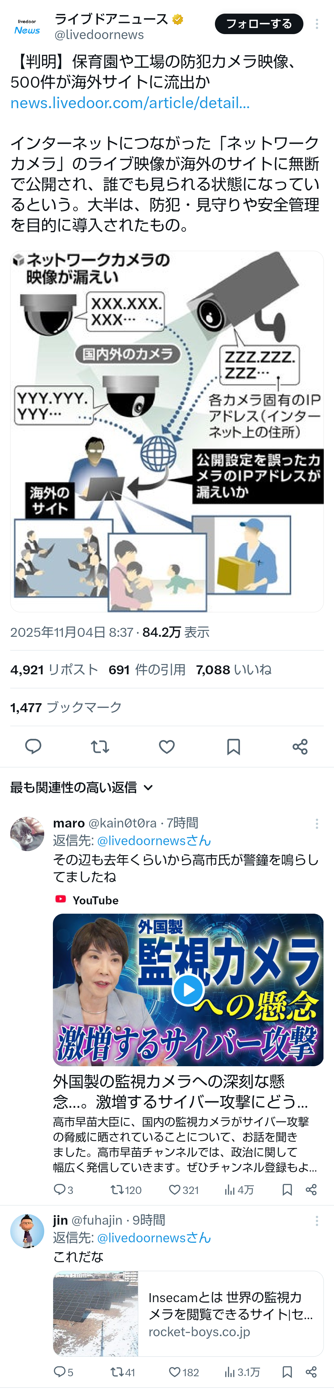 | … | 249無題Name名無し 25/11/04(火)18:39:10No.757737+ 1762249150762.png-(1746087 B) >【判明】保育園や工場の防犯カメラ映像、500件が海外サイトに流出か |