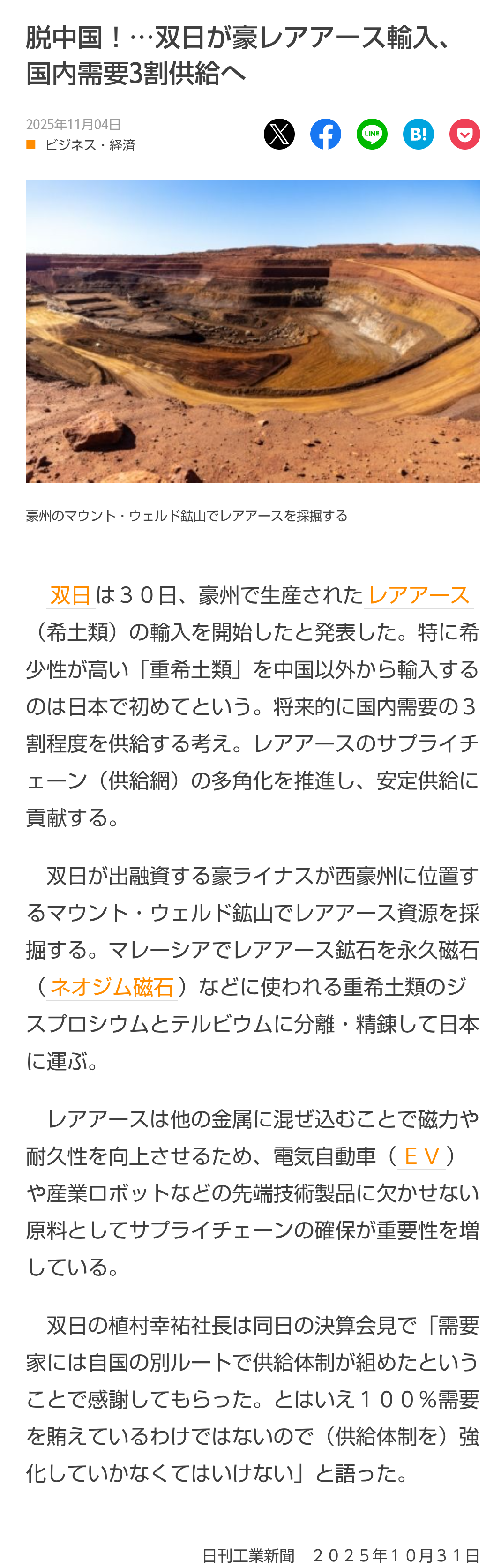 | … | 256無題Name名無し 25/11/04(火)18:58:49No.757744そうだねx1 1762250329878.png-(1254943 B) >脱中国!…双日が豪レアアース輸入、国内需要3割供給へ |
