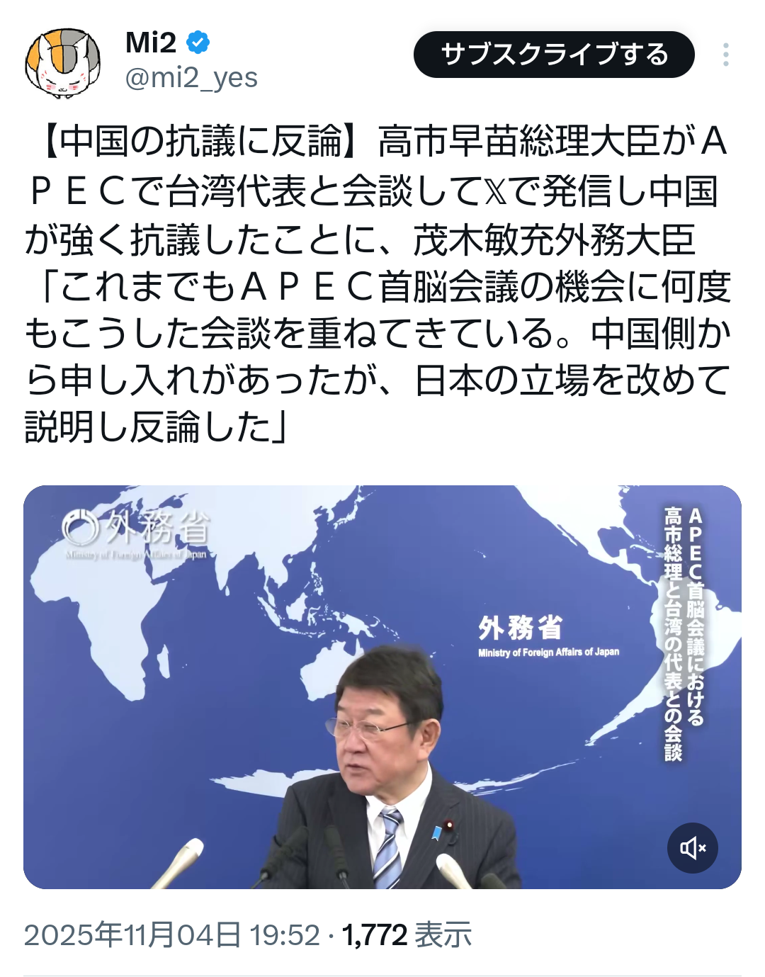| … | 23無題Name名無し 25/11/03(月)14:35:45No.757472+ 1762148145111.jpg-(193775 B) 理由:SNSで台湾と会談したことを写真付き報告したこと(前任者までの言動行動と違うことはSNSだけ) |