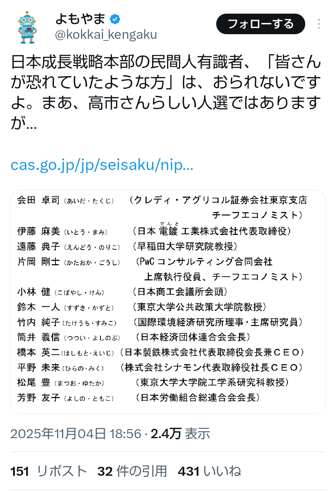 | … | 60無題Name名無し 25/11/03(月)17:59:38No.757511+ 1762160378946.jpg-(296548 B) https://x.com/kantei/status/1985268205343146078 |