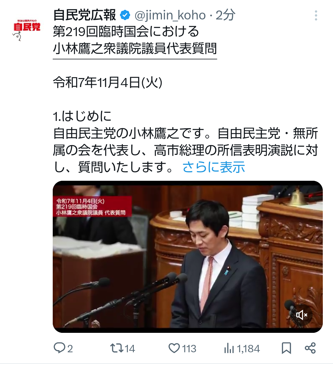 | … | 267無題Name名無し 25/11/04(火)20:51:52No.757757+ 1762257112345.png-(605108 B) >第219回臨時国会における小林鷹之衆議院議員代表質問 |