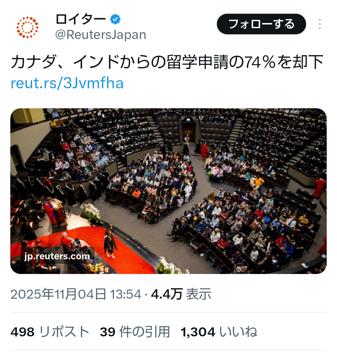 | … | 270無題Name名無し 25/11/04(火)21:53:48No.757760+ 1762260828536.png-(1015188 B) >カナダ、インドからの留学申請の74%を却下 |