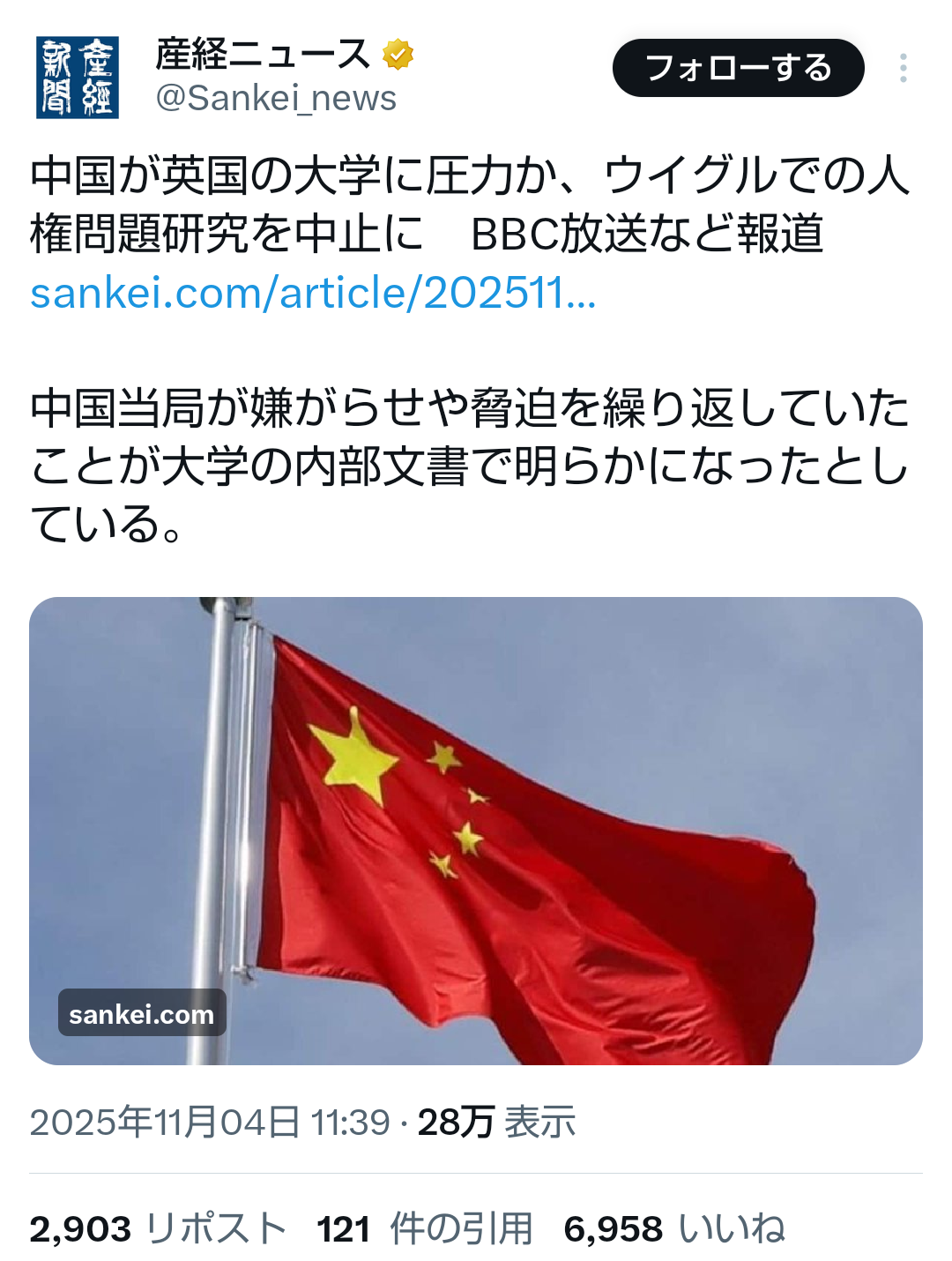 | … | 272無題Name名無し 25/11/04(火)22:15:24No.757762+ 1762262124681.png-(512323 B) >中国が英国の大学に圧力か、ウイグルでの人権問題研究を中止に BBC放送など報道 |