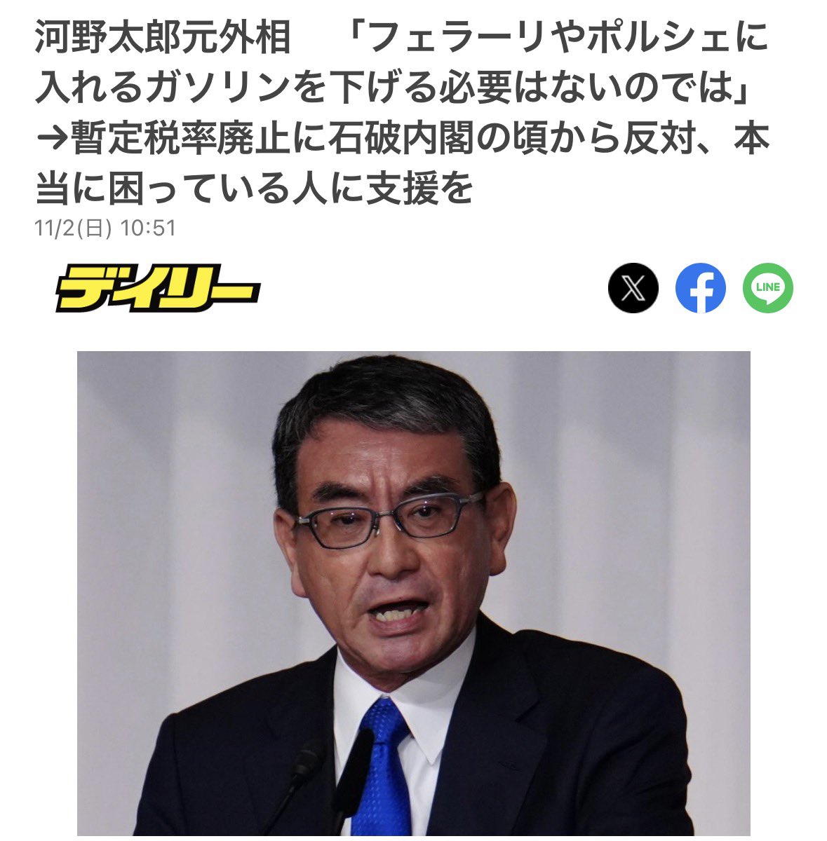 | … | 1無題Name名無し 25/11/03(月)19:04:51No.757530+河野氏は2日出演したTBS系「サンデージャポン」で、ガソリン暫定税率の年内廃止について与野党6党で合意した件について聞かれ「僕はずっと石破内閣の頃から反対だったんですね。だから今年の夏、日本の中でも42度になるというような、もう温暖化が進んでいる時に“化石燃料を普通に使っていいんだよ”っていうメッセージになってしまうのは非常にまずいなと。だから本当に困っている人にはガソリンだったり電気だったりの支援はするけども、何もフェラーリやポルシェに入れるガソリンの税金を下げる必要はないんじゃないの? …っていうのを僕はずっと言ってたんですが、もう6党で“これはやりましょう”ということになってしまいましたからやるんですけども」などと自身の見解を述べた。 |