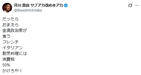 | … | 3無題Name名無し 25/11/03(月)19:05:29No.757532+ 1762164329442.jpg-(14077 B) 井川氏は、河野氏が「フェラーリやポルシェに入れるガソリンの税金を下げる必要は…」と話した部分を見出しにとった、同氏のこれらの発言を報じた一部メディアの記事を添付。「だったら おまえら金満政治家が食う フレンチ イタリアン 割烹料理には 消費税50%かけろや!」と記した。 |