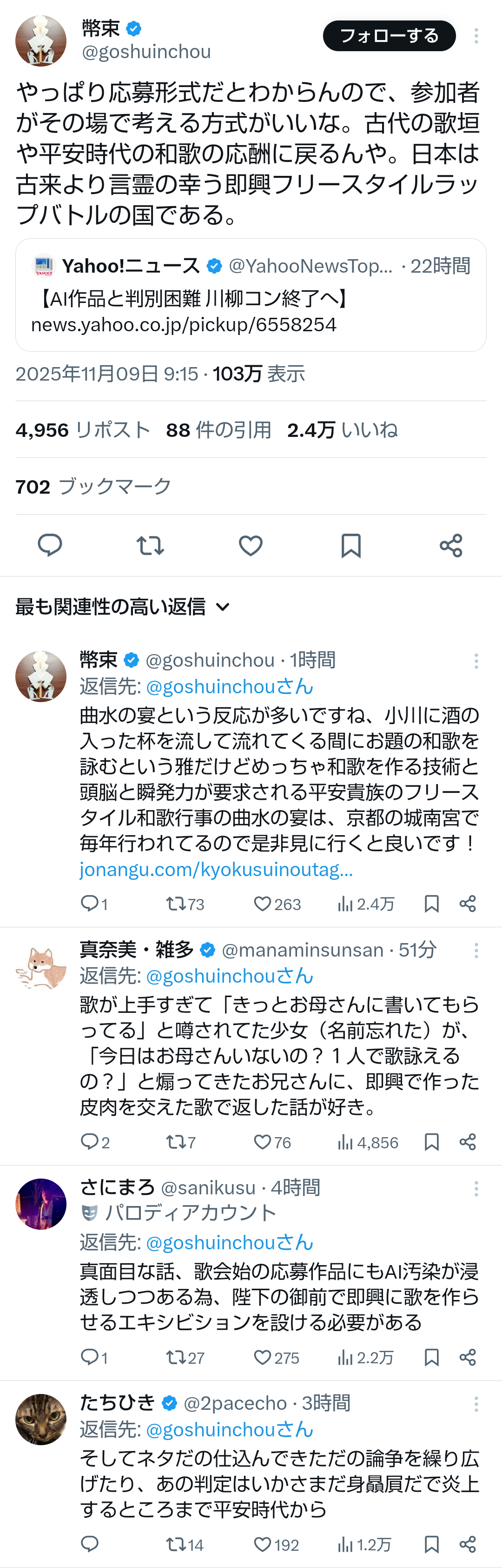 | … | 5無題Name名無し 25/11/09(日)15:57:02No.758650そうだねx1 1762671422810.png-(870745 B) https://x.com/goshuinchou/status/1987312935384035809 |