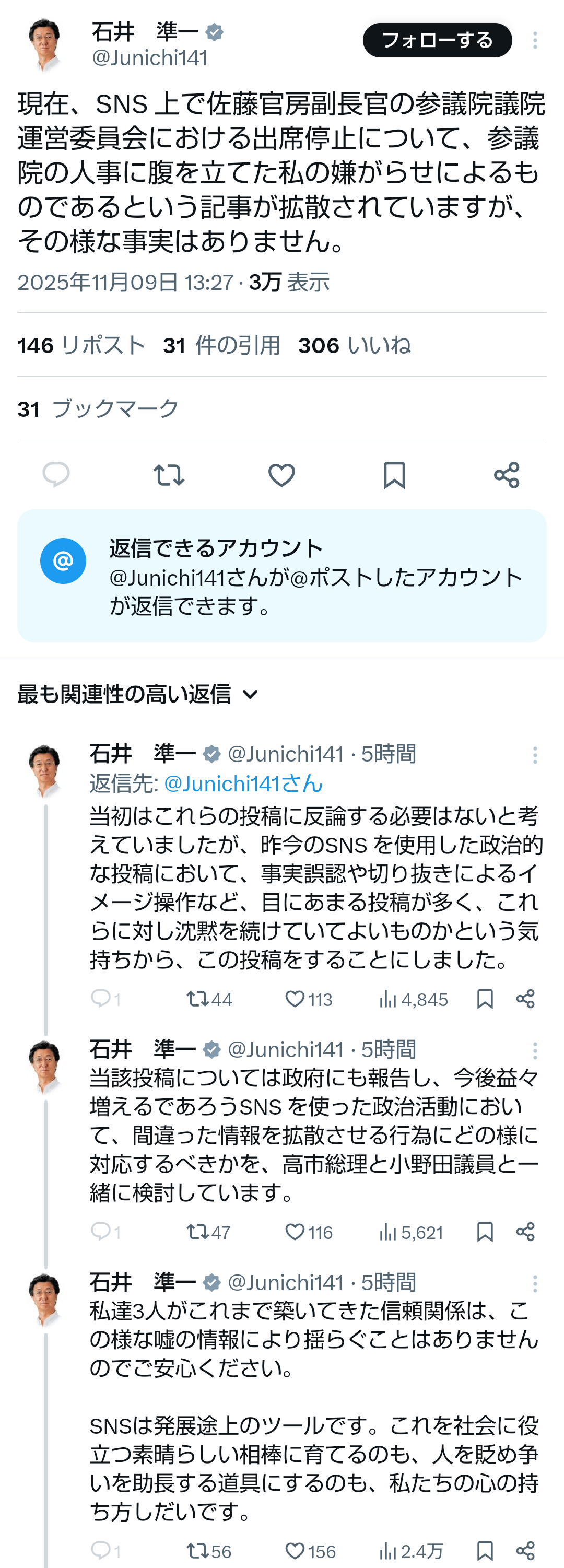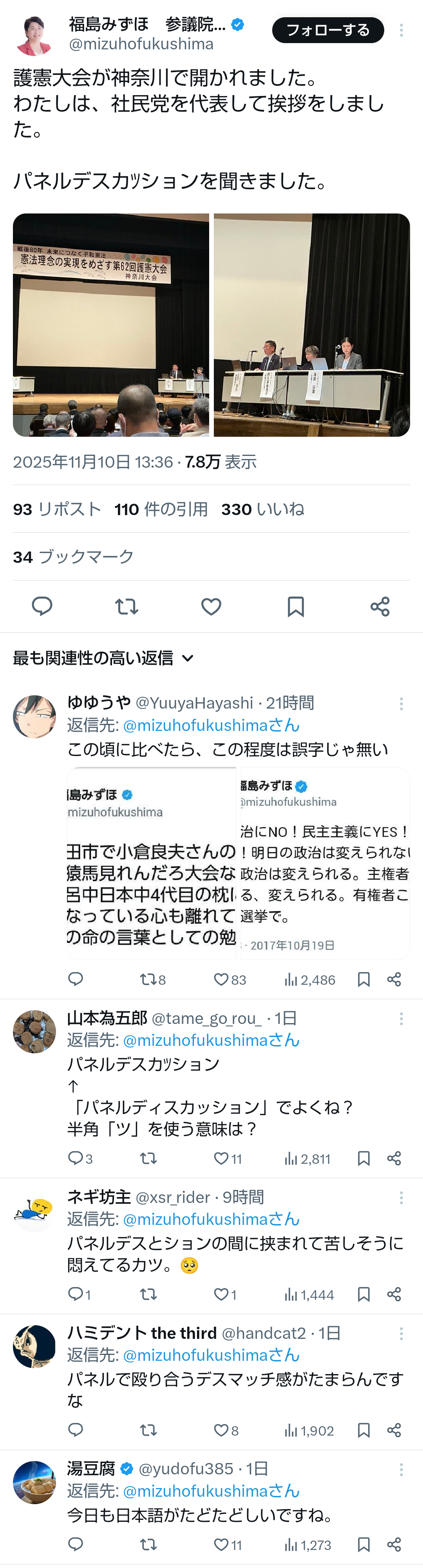 | … | 54無題Name名無し 25/11/09(日)20:12:02No.758703そうだねx4>「(発言の)一部を取り上げて何かを指摘するというのは私はそれは違うと思う」 |