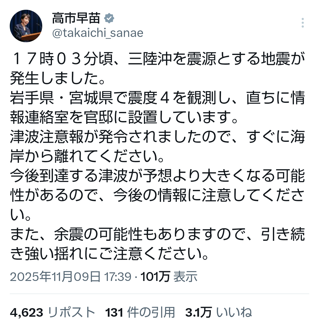 | … | 23無題Name名無し 25/11/09(日)17:21:53No.758670+三陸沖の震度4で津波警報ねえ |