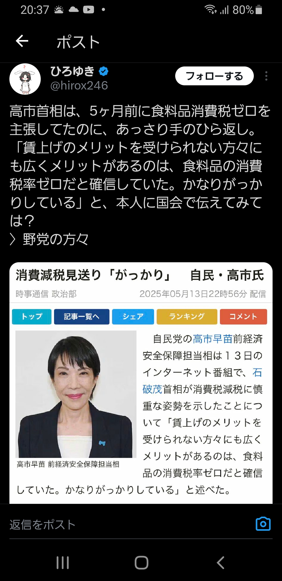 | … | 72無題Name名無し 25/11/09(日)21:10:39No.758721そうだねx9総裁公約にも食品消費税0%とか上げてないし |