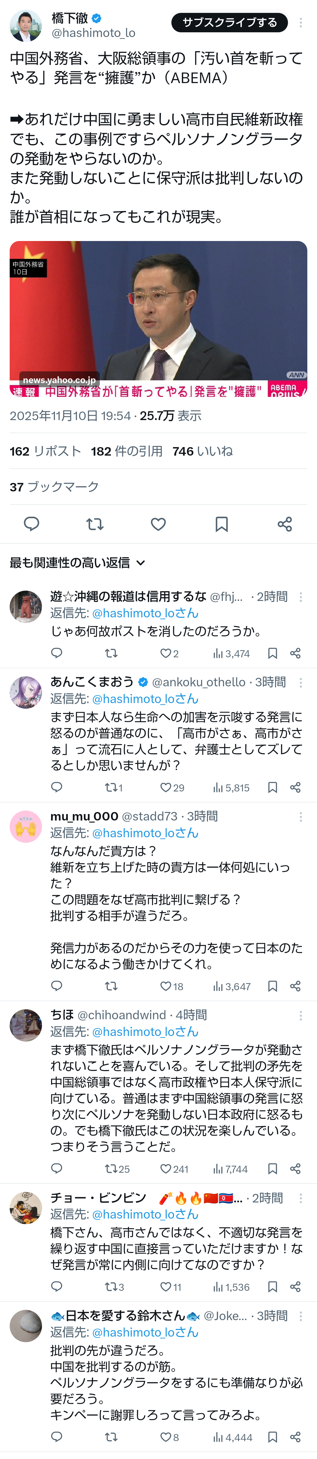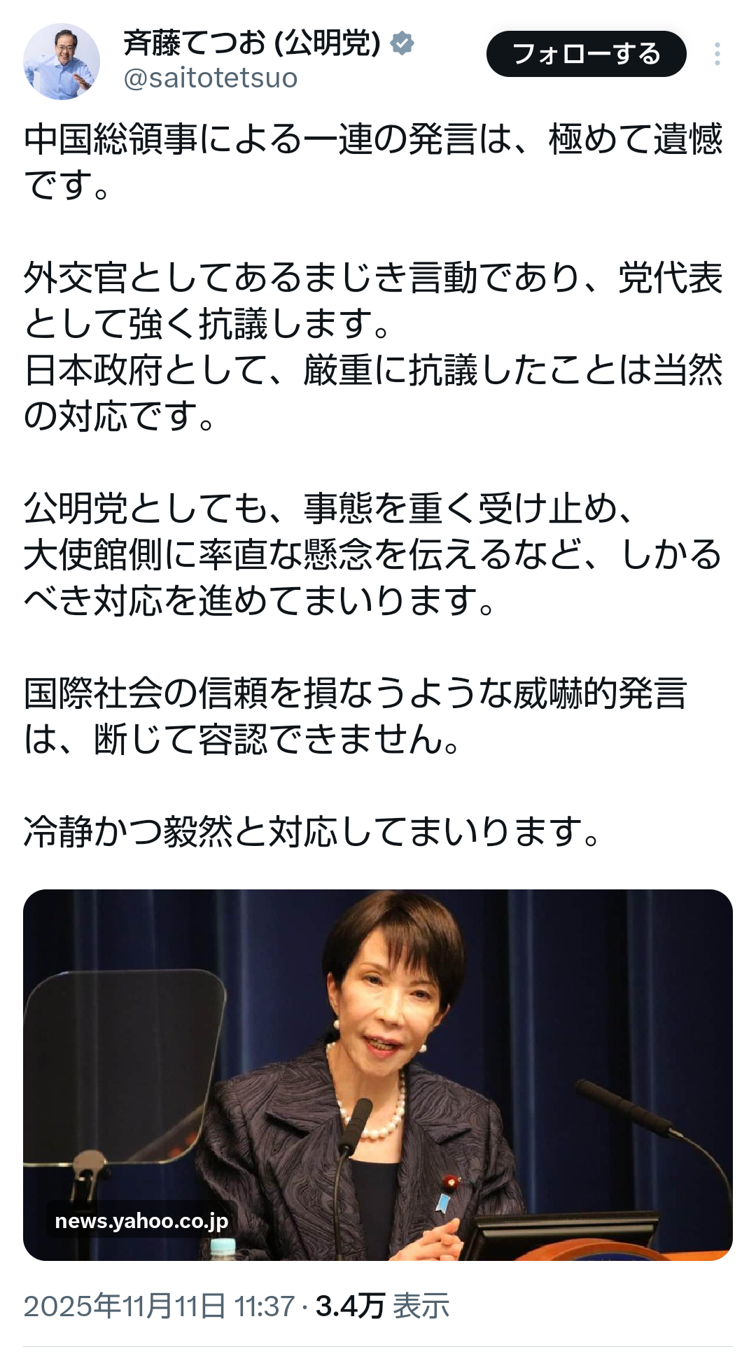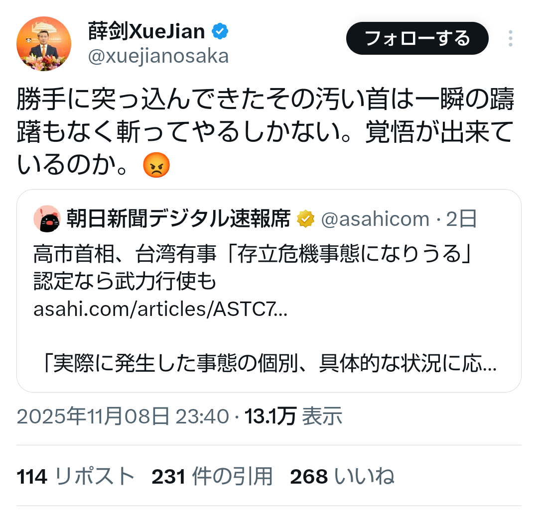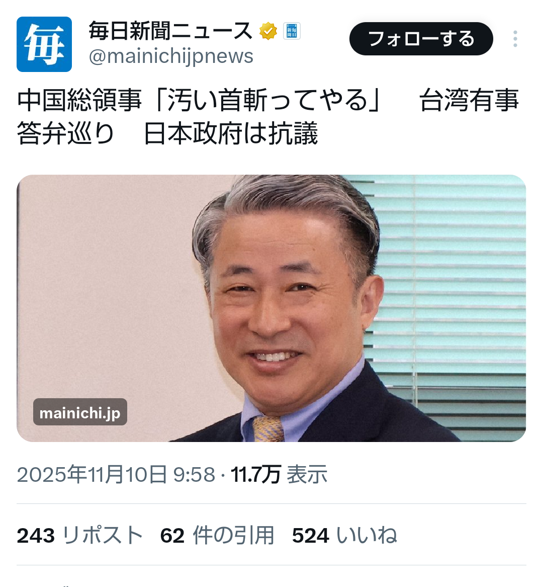 | … | 87無題Name名無し 25/11/09(日)22:03:53No.758737そうだねx17>>中国の大阪総領事「その汚い首は斬ってやるしかない」 高市首相の台湾有事巡る答弁に投稿 |