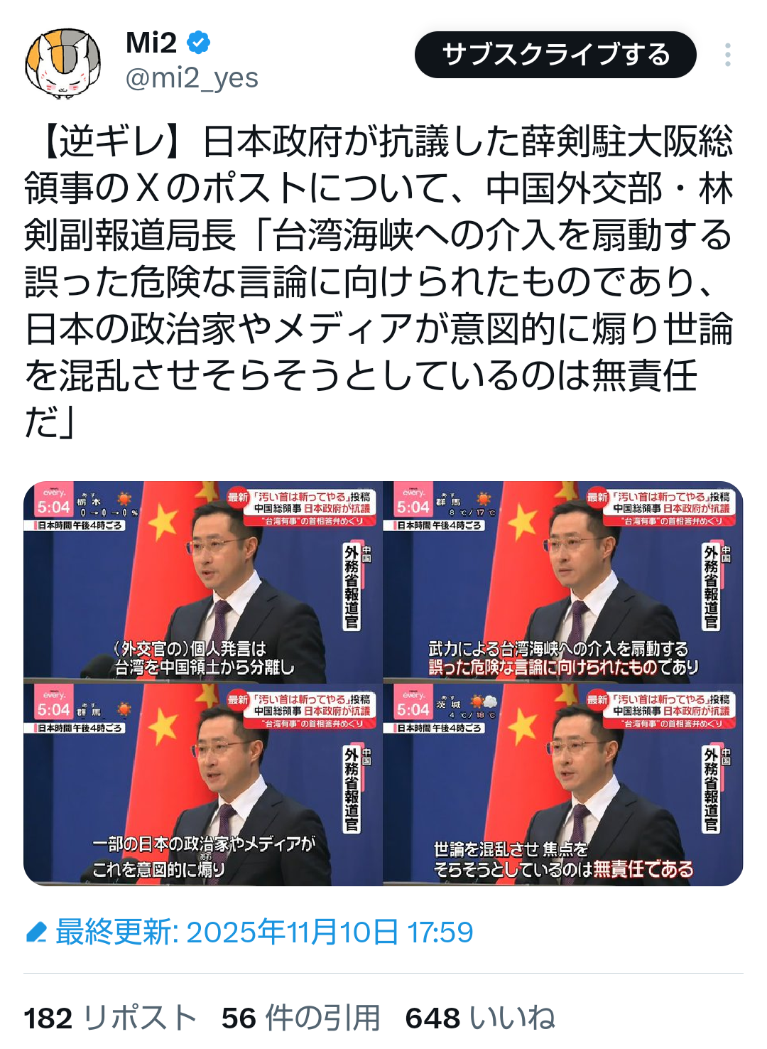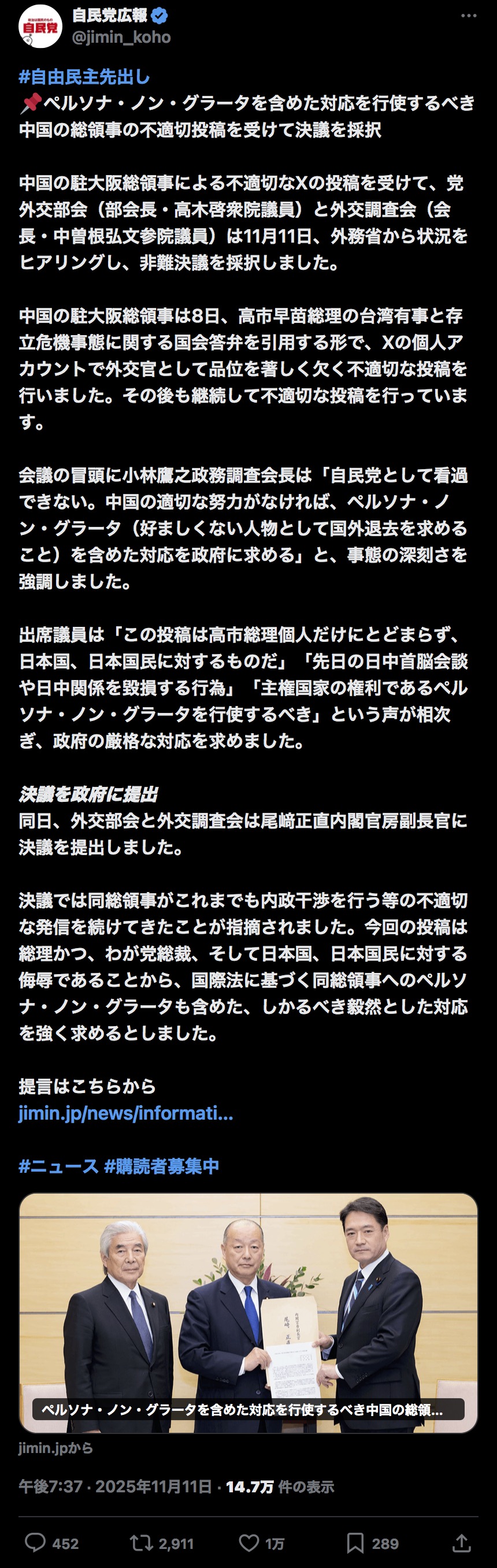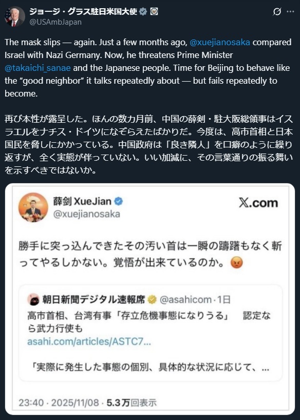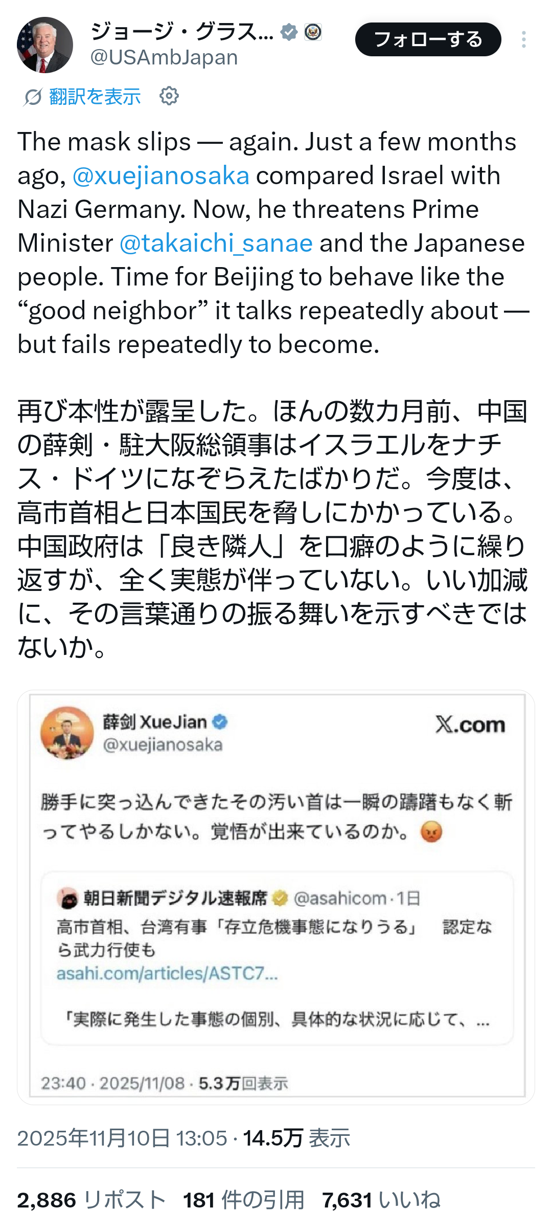 | … | 87無題Name名無し 25/11/09(日)22:03:53No.758737そうだねx17>>中国の大阪総領事「その汚い首は斬ってやるしかない」 高市首相の台湾有事巡る答弁に投稿 |