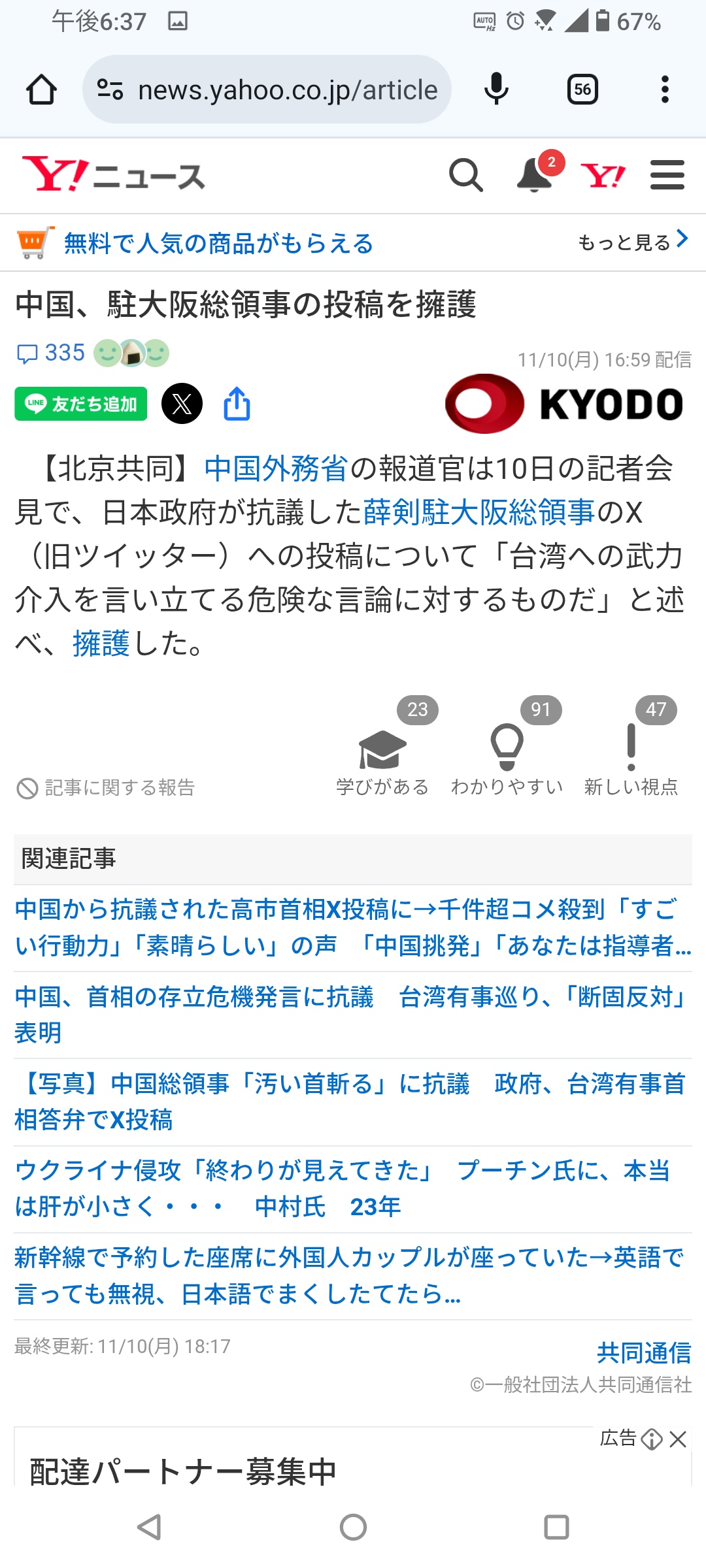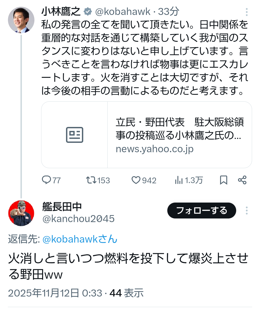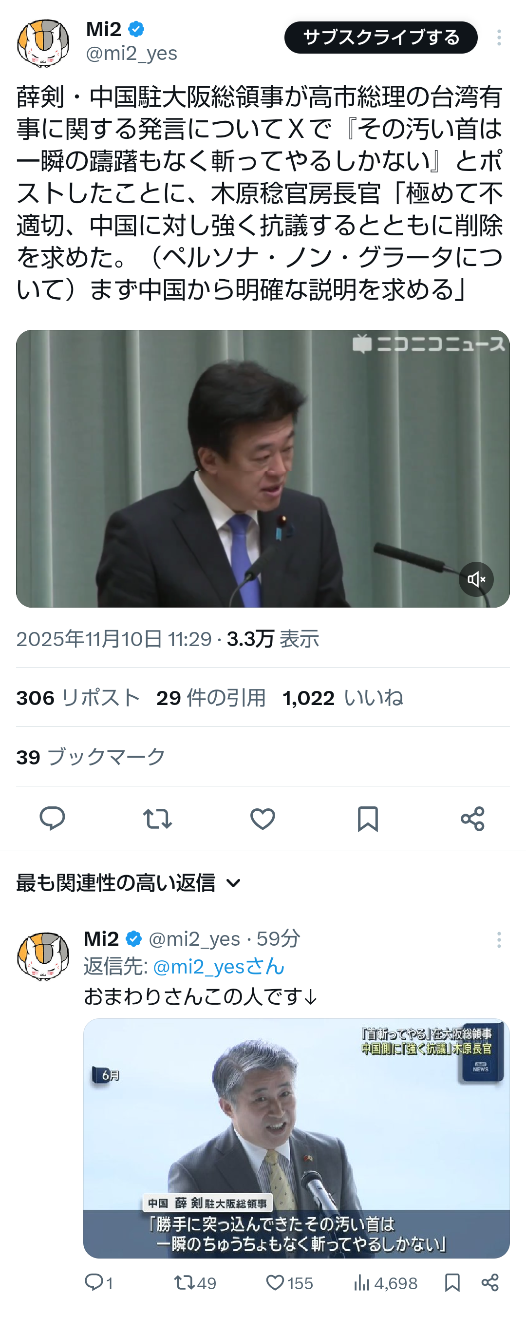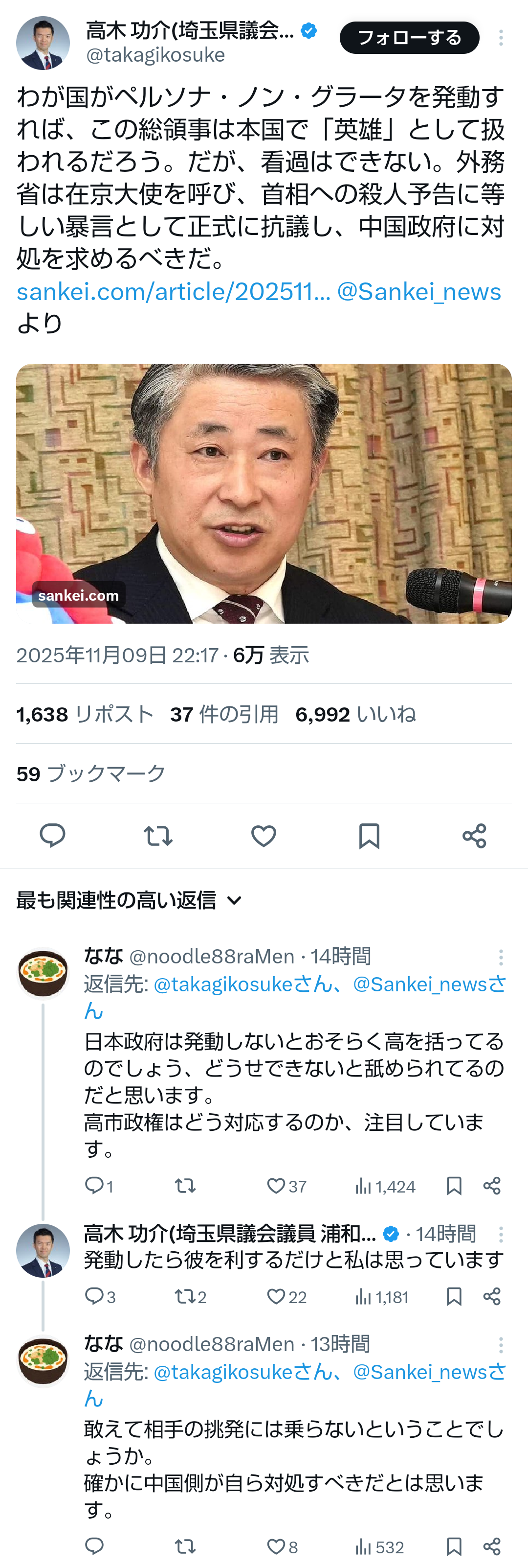 | … | 87無題Name名無し 25/11/09(日)22:03:53No.758737そうだねx17>>中国の大阪総領事「その汚い首は斬ってやるしかない」 高市首相の台湾有事巡る答弁に投稿 |