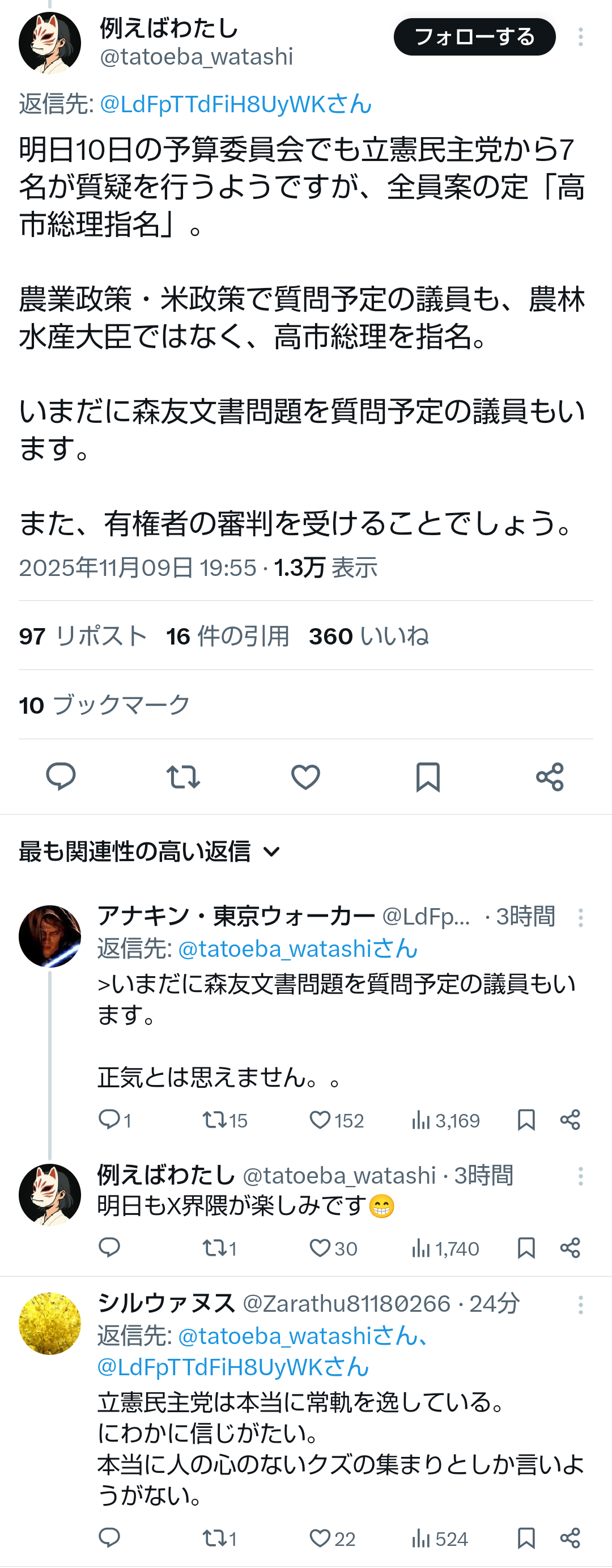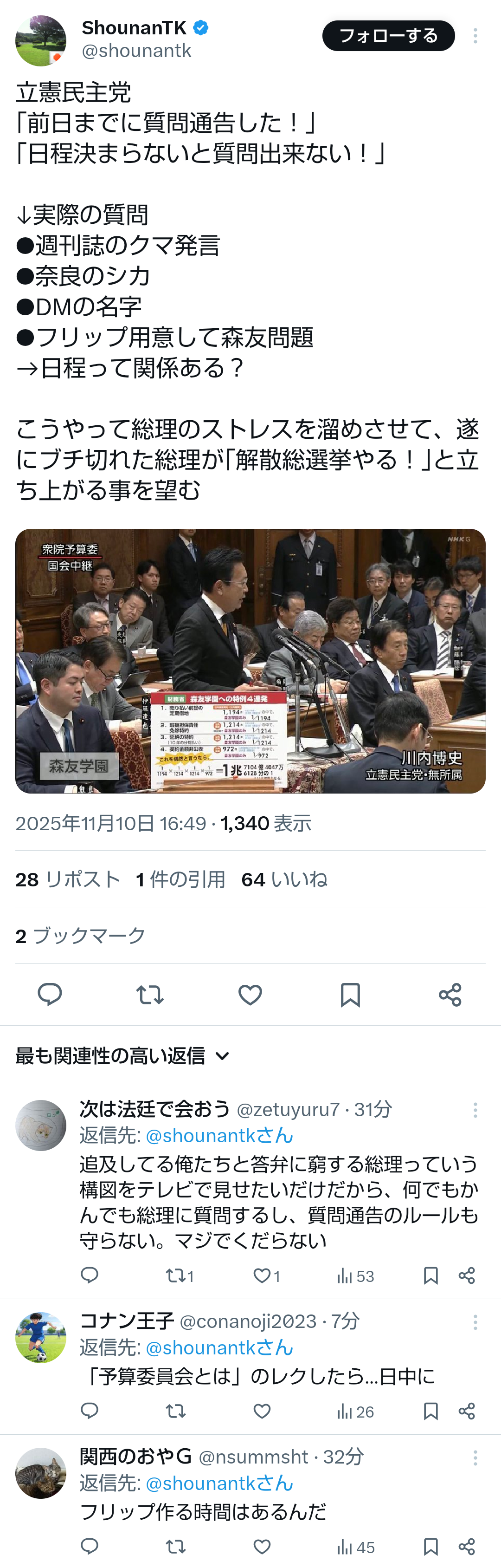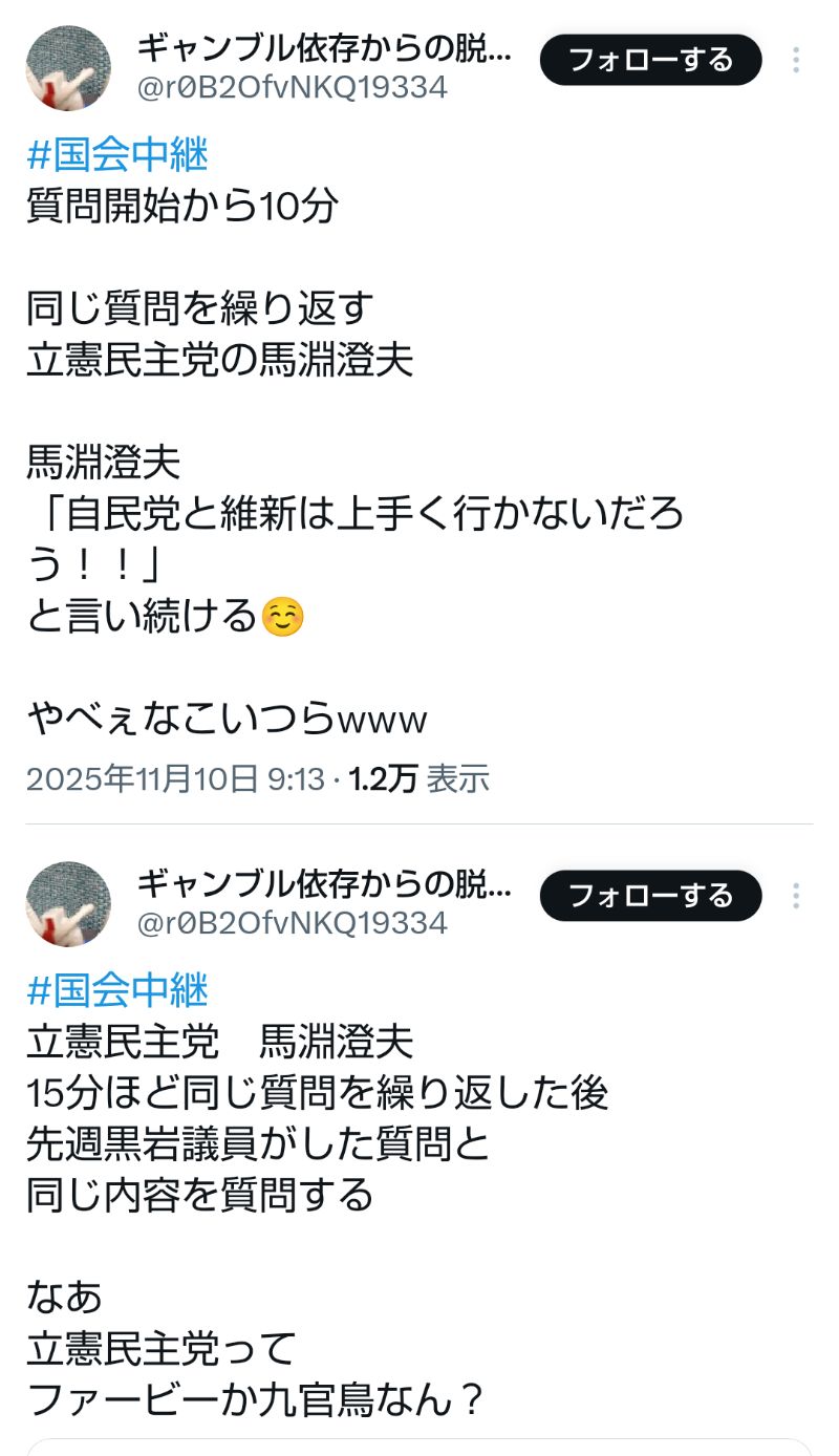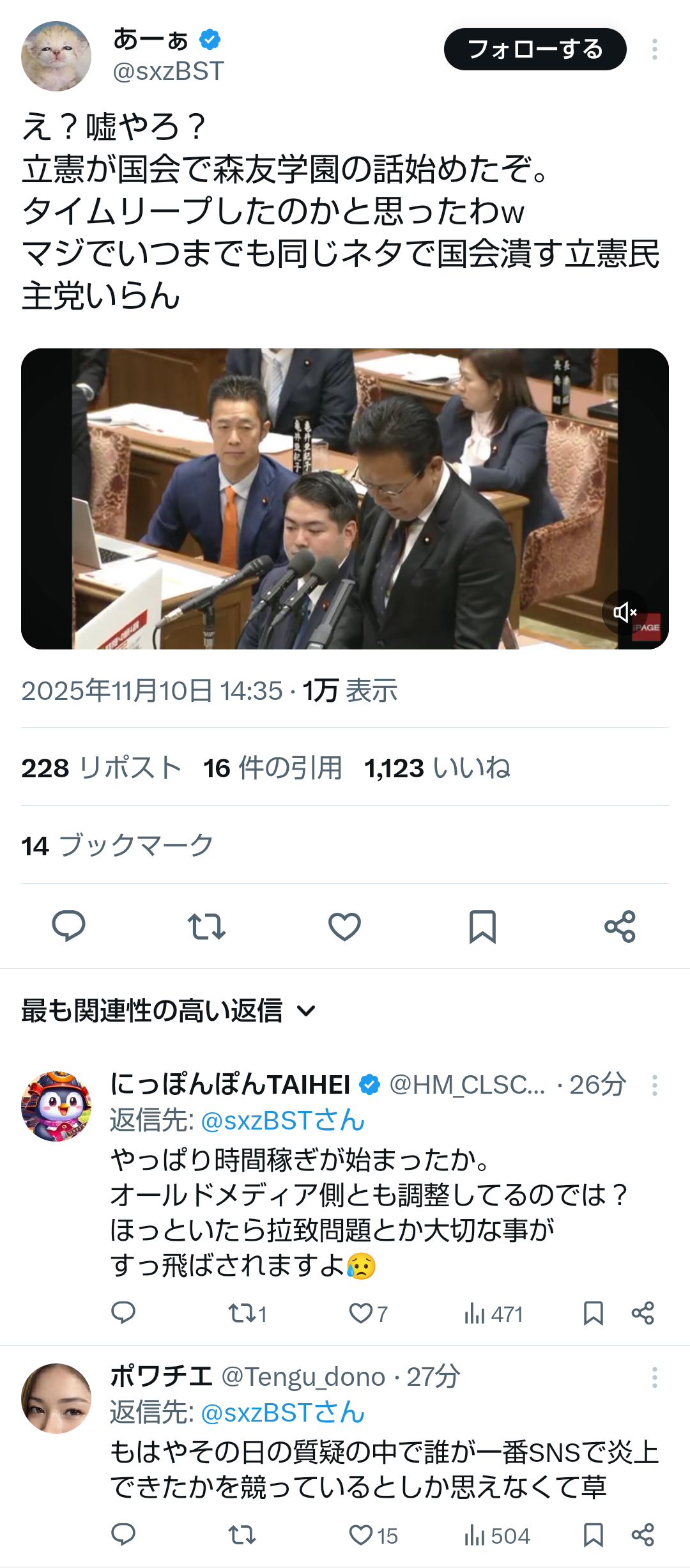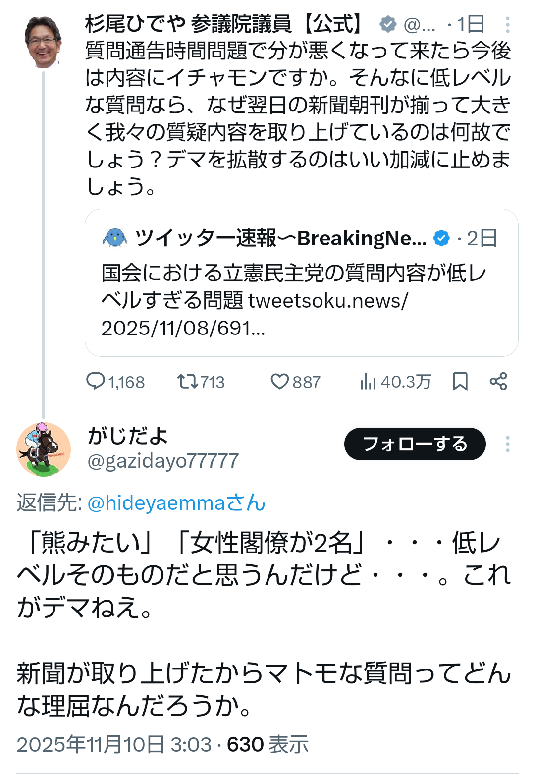 | … | 606無題Name名無し 25/11/12(水)15:40:41No.759370+まともな立憲議員の質疑も一人くらいはいるんだけど頭おかしいのばっかり目立つので全く目立たない |