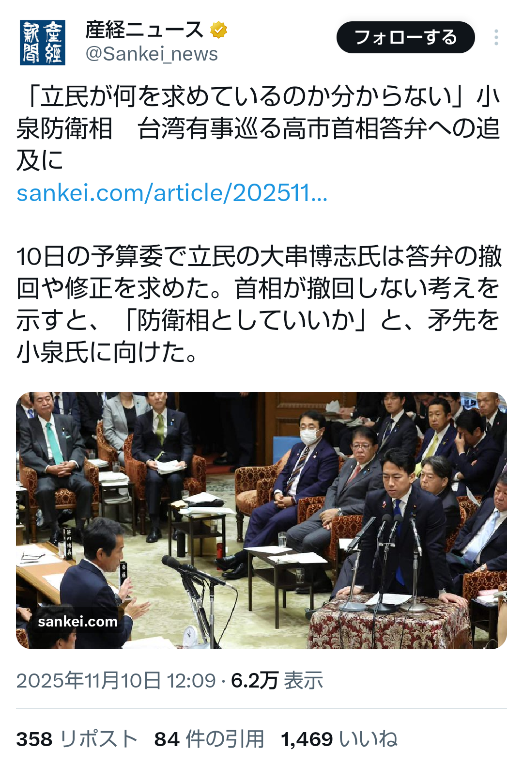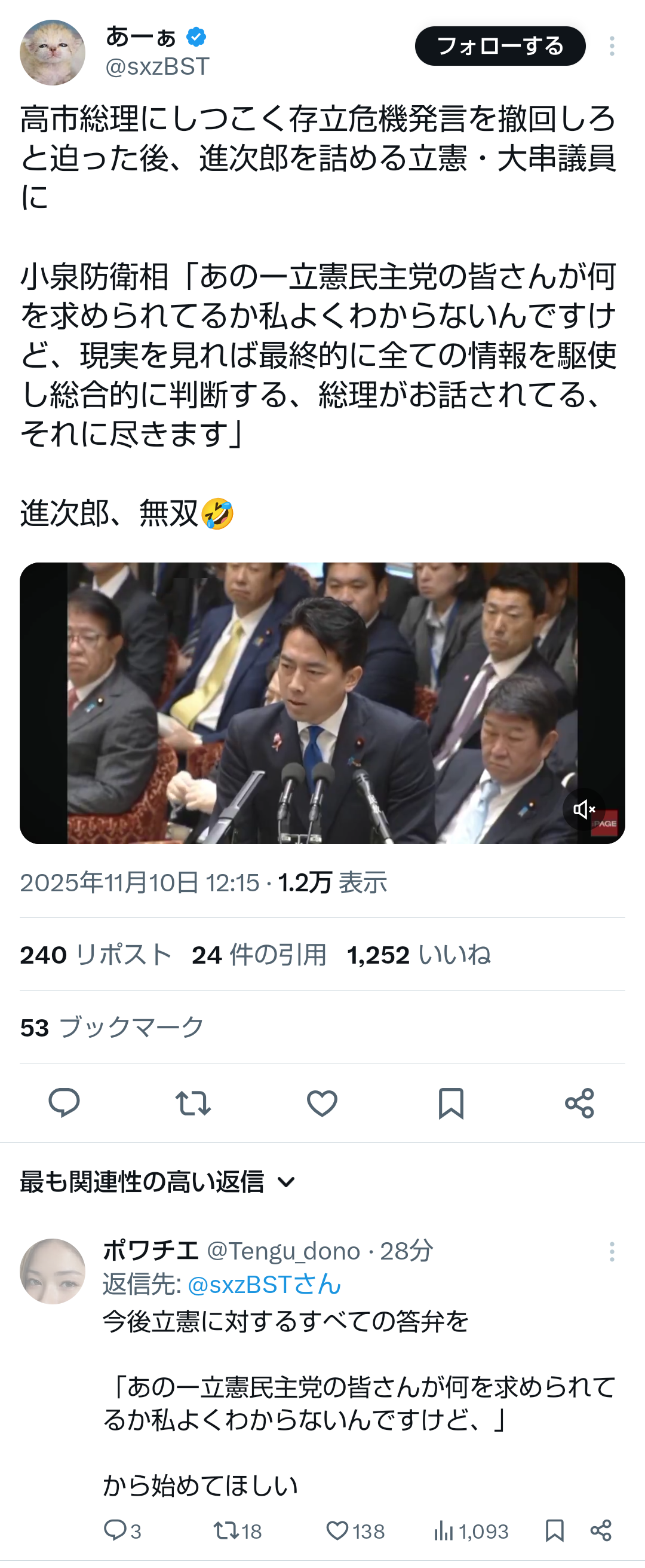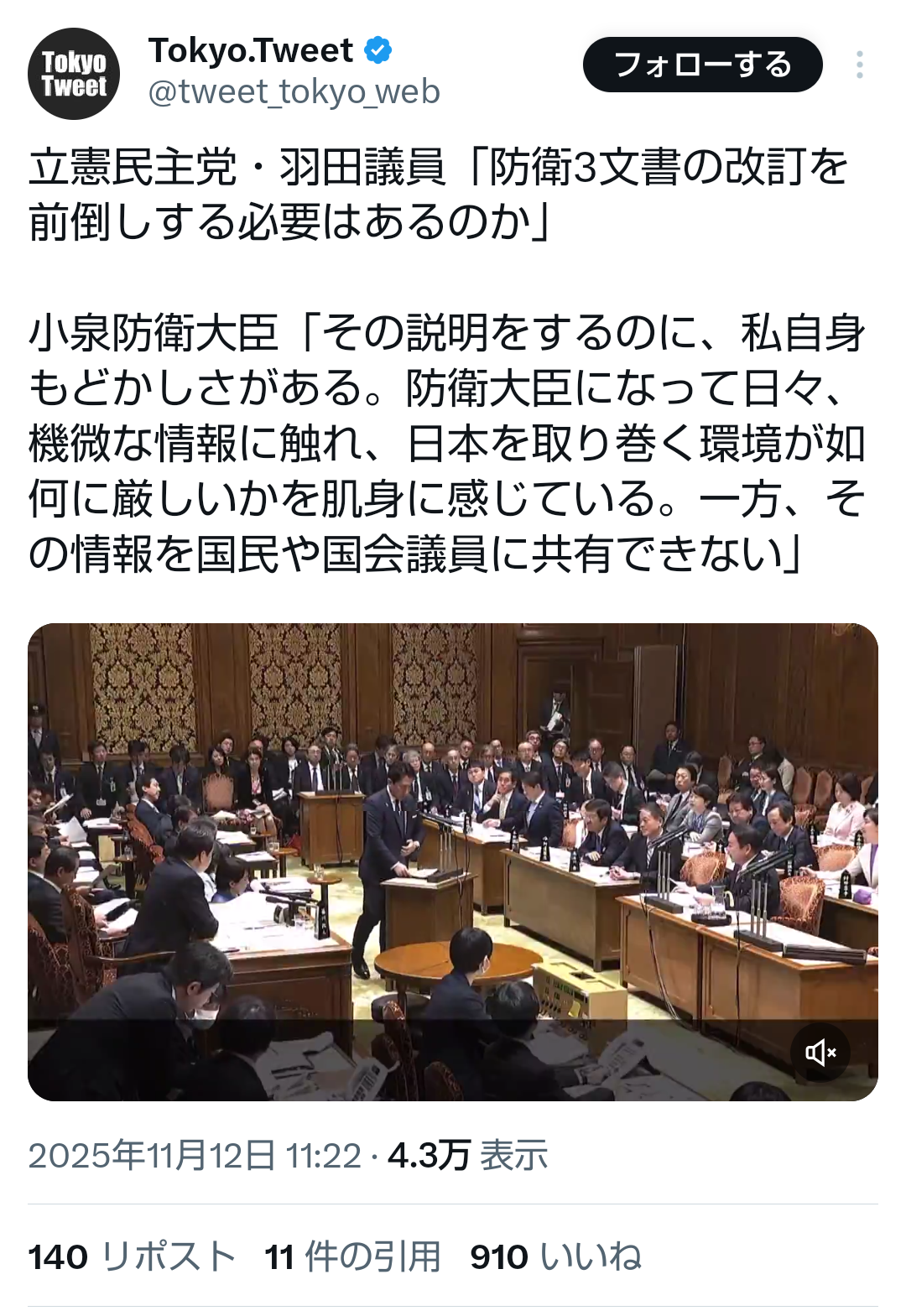 | … | 568無題Name名無し 25/11/12(水)12:28:55No.759319そうだねx2 1762918135992.png-(1096567 B) >立憲民主党・羽田議員「防衛3文書の改訂を前倒しする必要はあるのか」 |