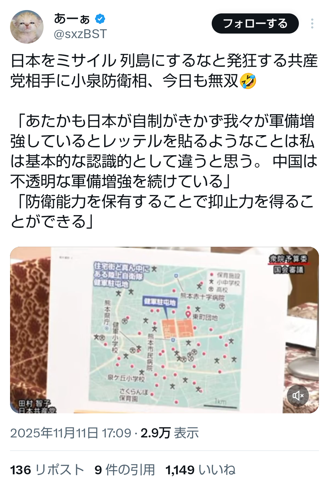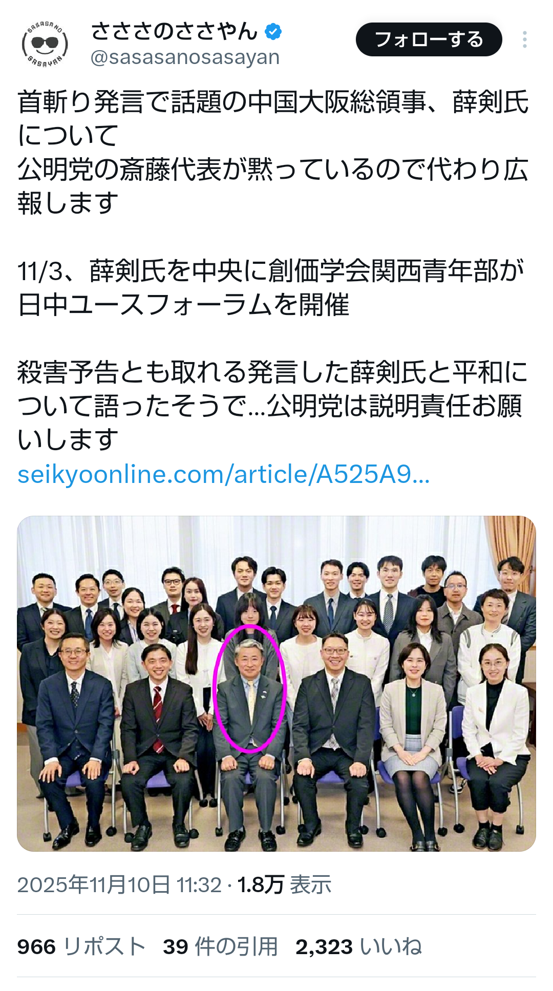 | … | 91無題Name名無し 25/11/09(日)22:15:30No.758743そうだねx3 1762694130201.jpg-(197090 B) >>>中国の大阪総領事「その汚い首は斬ってやるしかない」 高市首相の台湾有事巡る答弁に投稿 |