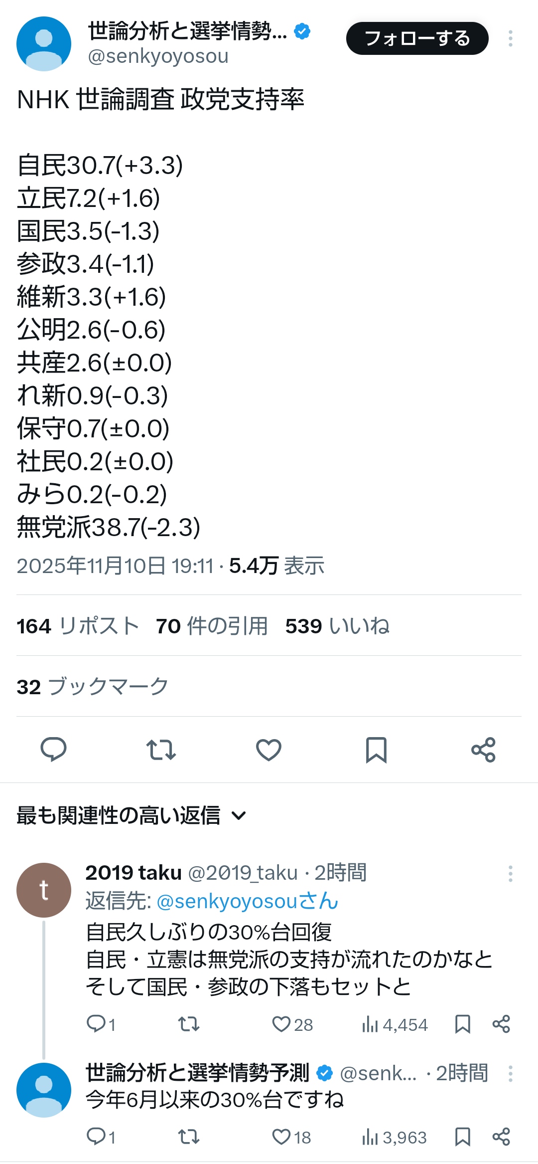 | … | 38無題Name名無し 25/11/09(日)18:51:24No.758687+今日は高市さん関連のXがほとんど流れて来ないし流石に休めたのかな |