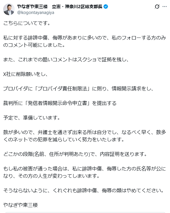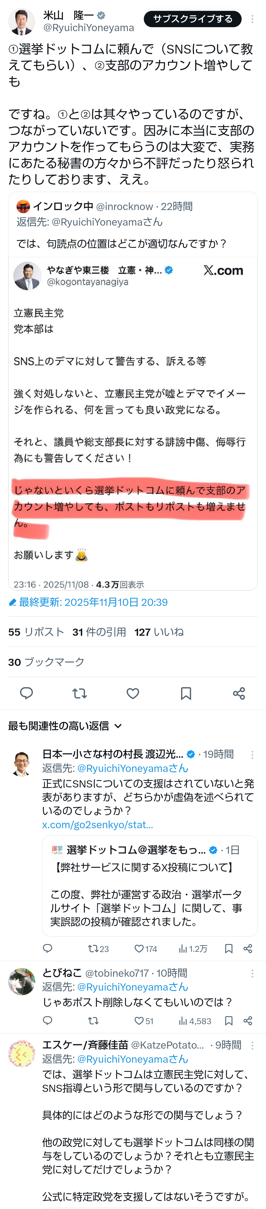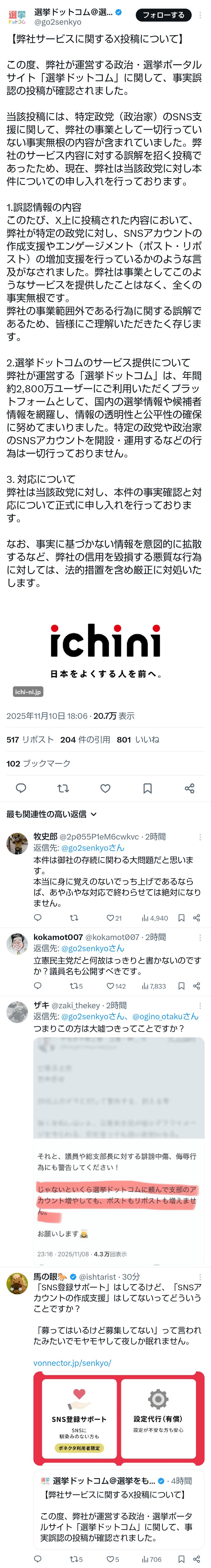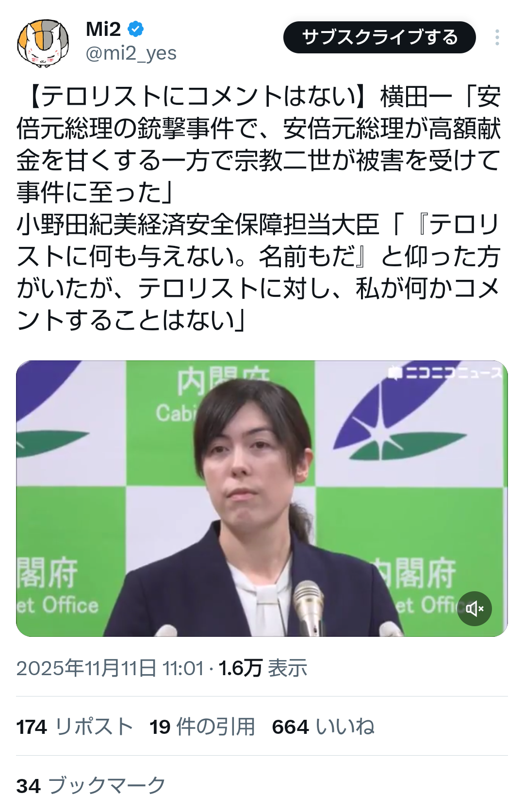 | … | 43無題Name名無し 25/11/09(日)19:01:22No.758692そうだねx3>さらに「当該投稿については政府にも報告し、今後益々増えるであろうSNSを使った政治活動において、間違った情報を拡散させる行為にどの様に対応するべきかを、高市総理と小野田議員と一緒に検討しています」 |
