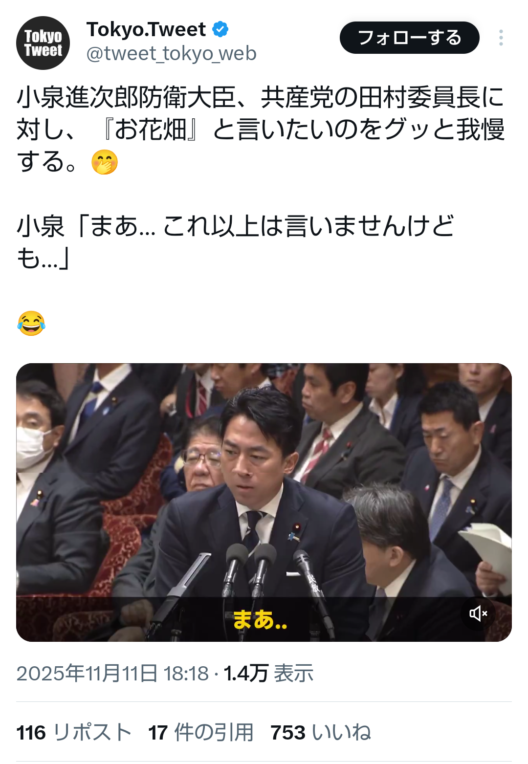 | … | 41無題Name名無し 25/11/09(日)18:58:39No.758690+ 1762682319225.png-(277863 B) >今日は高市さん関連のXがほとんど流れて来ないし流石に休めたのかな |