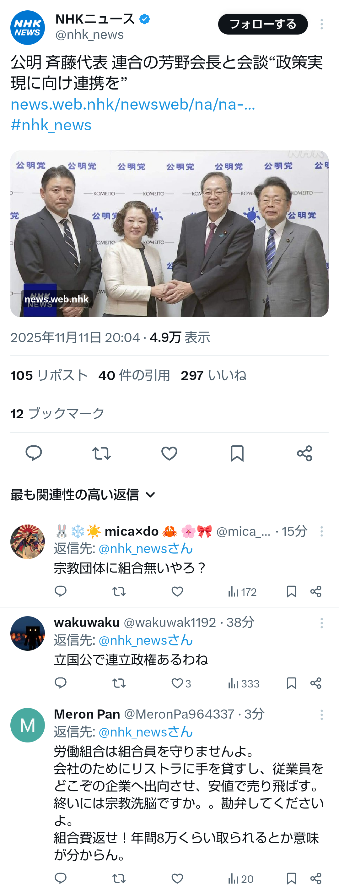 | … | 527無題Name名無し 25/11/11(火)22:28:47No.759267+ 1762867727947.png-(980915 B) >公明 斉藤代表 連合の芳野会長と会談“政策実現に向け連携を” |