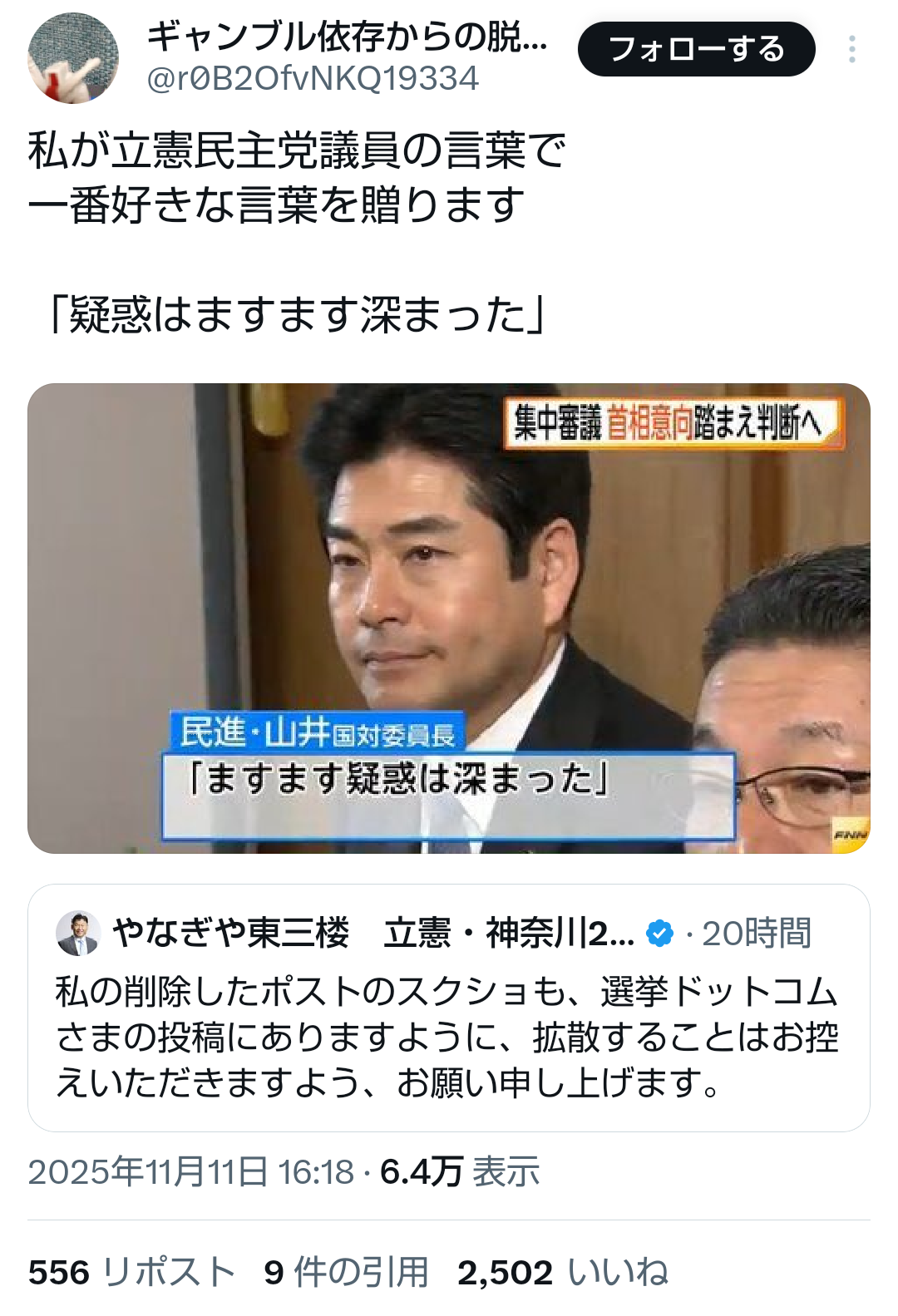 | … | 544無題Name名無し 25/11/12(水)06:48:15No.759289そうだねx2立憲側もきっと燃やしたいわけじゃないんだよ |