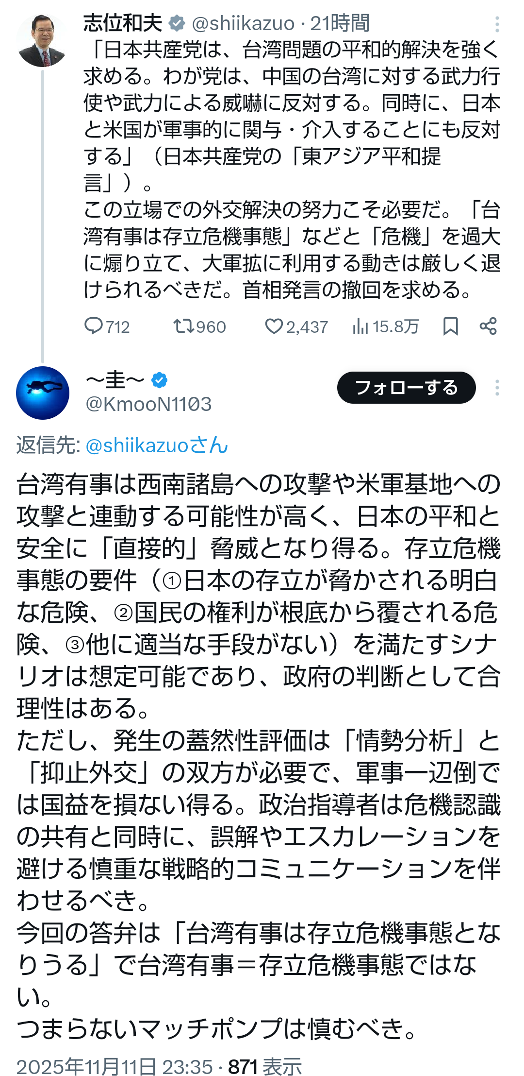 | … | 570無題Name名無し 25/11/12(水)12:30:58No.759321そうだねx1踏み込んだ仮定の話をして危機を煽り立てたのは他ならぬ立憲民主党だからな |