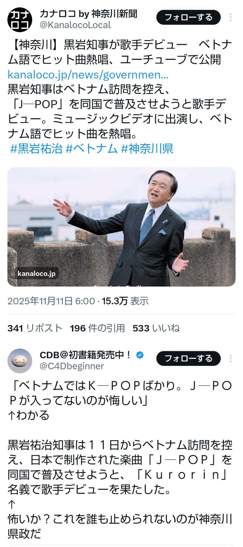 | … | 576無題Name名無し 25/11/12(水)12:53:37No.759329+ 1762919617429.jpg-(209679 B) >【神奈川】黒岩知事が歌手デビュー ベトナム語でヒット曲熱唱、ユーチューブで公開 |