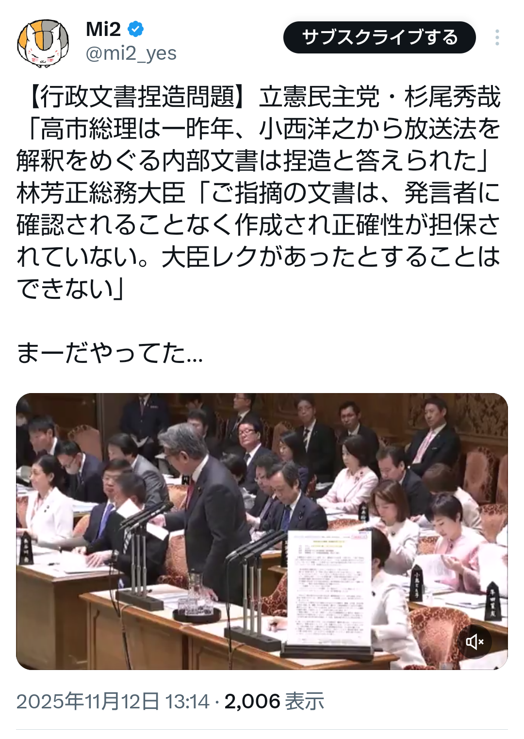 | … | 587無題Name名無し 25/11/12(水)13:35:08No.759340+ 1762922108023.png-(978415 B) >【行政文書捏造問題】立憲民主党・杉尾秀哉「高市総理は一昨年、小西洋之から放送法を解釈をめぐる内部文書は捏造と答えられた」 |