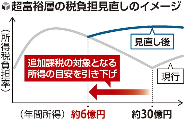 政府・与党は2026年度税制改正で、超富裕層に追加の税負担を課す年間所得の目安を現行の約30億円から約6億円に引き下げる方向で最終調整に入った。年内にまとめる税制改正大綱に盛り込み、27年からの適用を目指す。年間所得が1億円を超えると所得税の負担率が下がる「1億円の壁」を是正する狙いがある。
