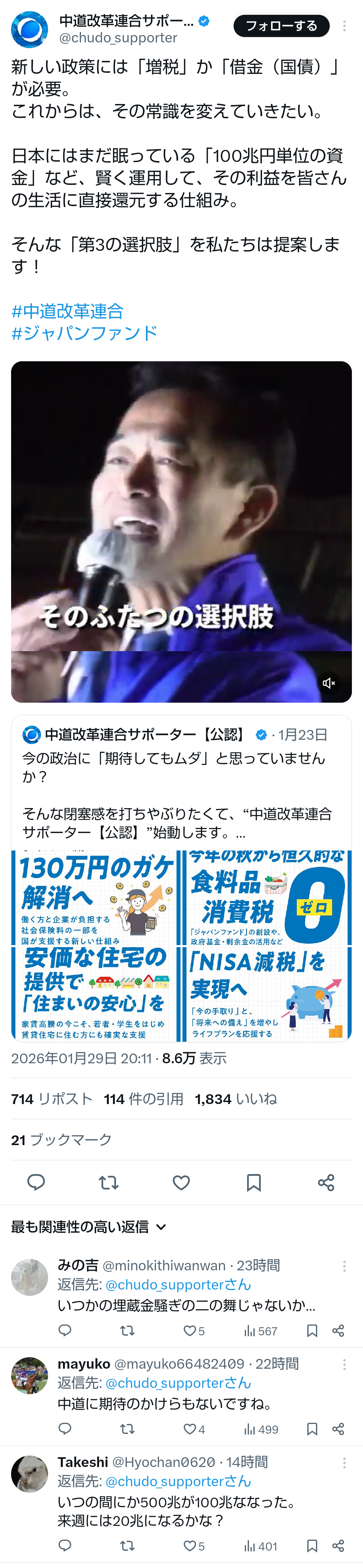 | … | 337無題Name名無し 26/02/01(日)12:32:12No.776038+>恒久減税の財源はファンド!て主張崩してなかったな |